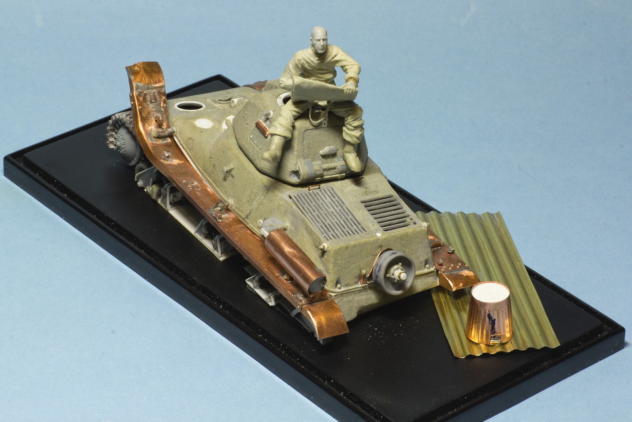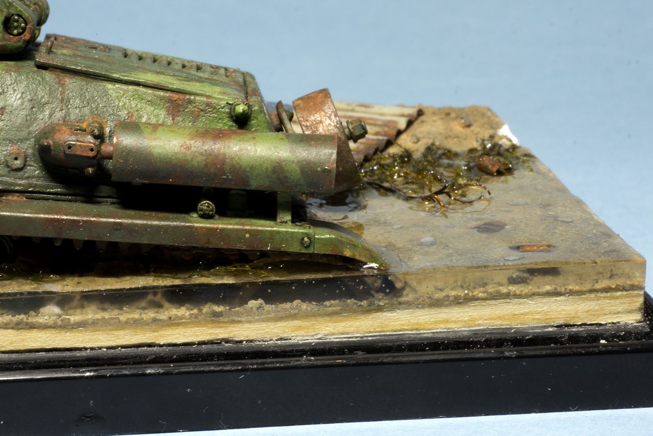При "утоплении" танка на 3-4 мм очень бы хотелось увидеть прозрачную водичку и может быть стоит "поднять" всю композицию за счет бортиков над поверхностью подставки...типа, чтоб читалась глубина воды за танком. Но, это так - мысли вслух. Еще раз повторюсь: проект нравится, слежу с интересом!