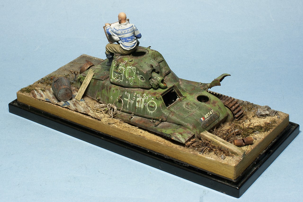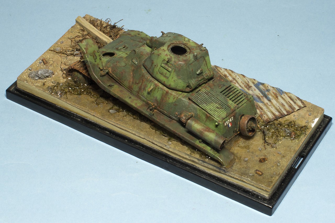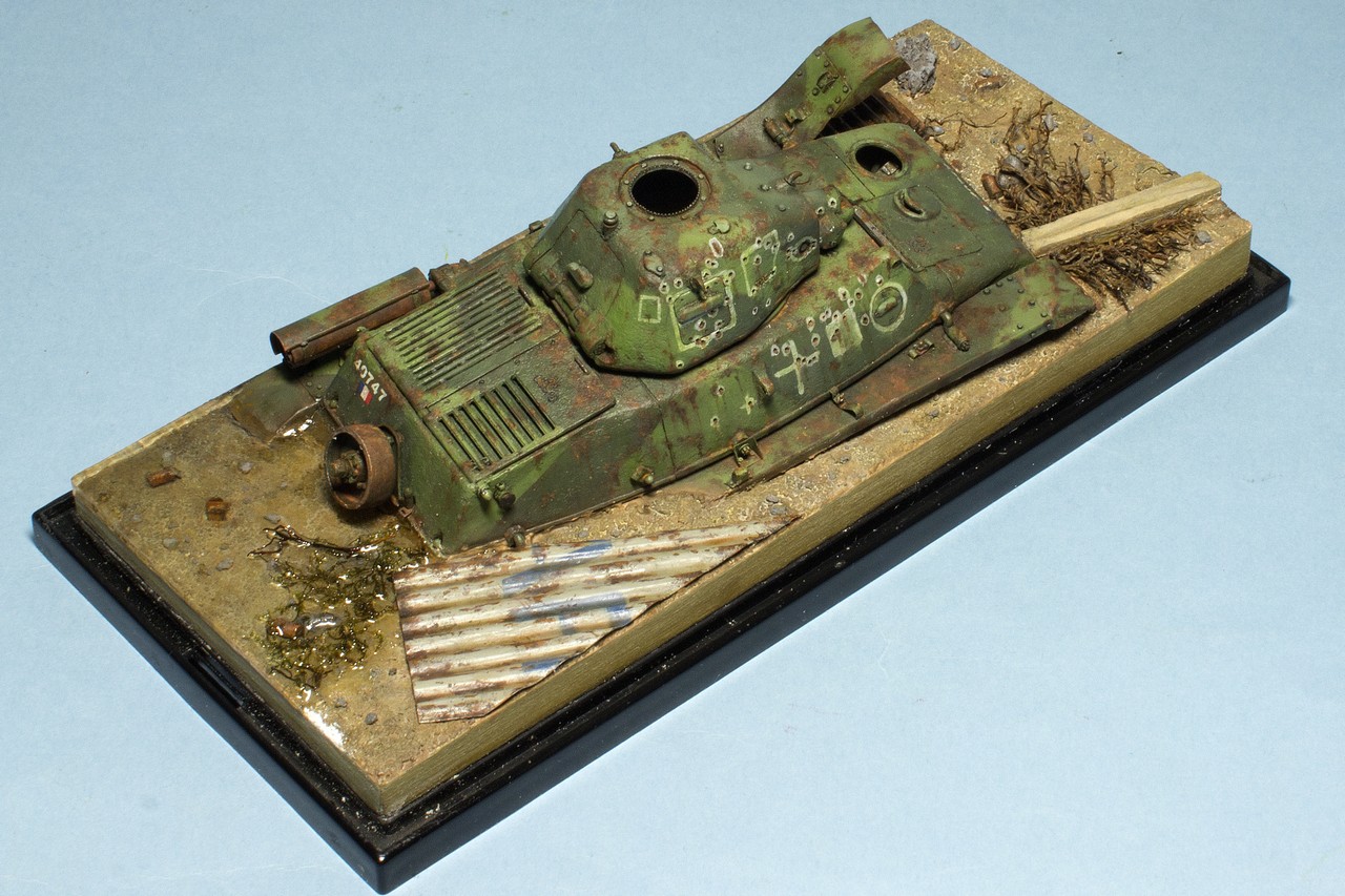 Собрал танчик из разрозненных частей. Окраска еще не закончена, я остановился после фильтров, масляных точек и прорисовки ржавчины маслом. По ржавчине у меня ощущение, что переборщил, но впереди еще грязи и пыль, может будет не так заметно. Но сначала нужно сделать мир вокруг модельки - т.е. подставку. Танк будет "утоплен" в подставке миллиметра на 3-4.