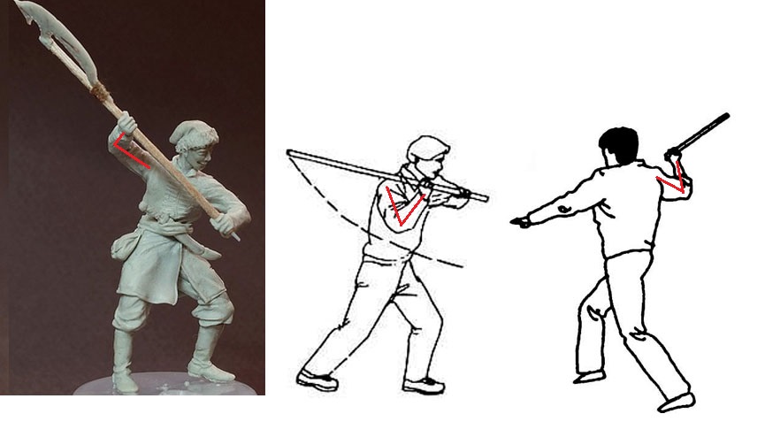 2. Любой удар имеет свою "механику" движения, которая обусловлена с одной стороны анатомией человека, с другой - его боевыми навыками. Но, в данном случае Ваш персонаж полностью им противоречит. Дело в том, что кинематика удара с таким замахом (независимо от того, с каким древком оружие - с длинным, или с коротким) диктует совершенно другое положение правой руки. В этот момент предплечье в принципе не может стремиться к горизонтали, потому как локоть здесь уходит вниз, "тяня" за собой плечо и предплечье.