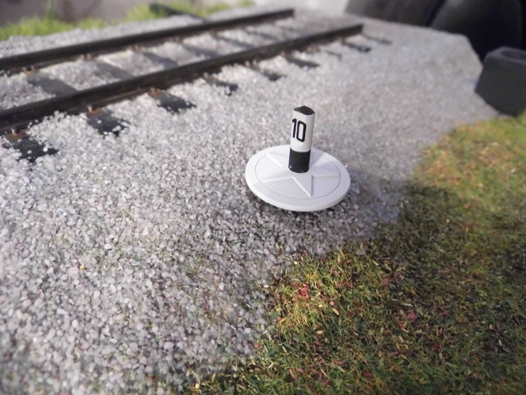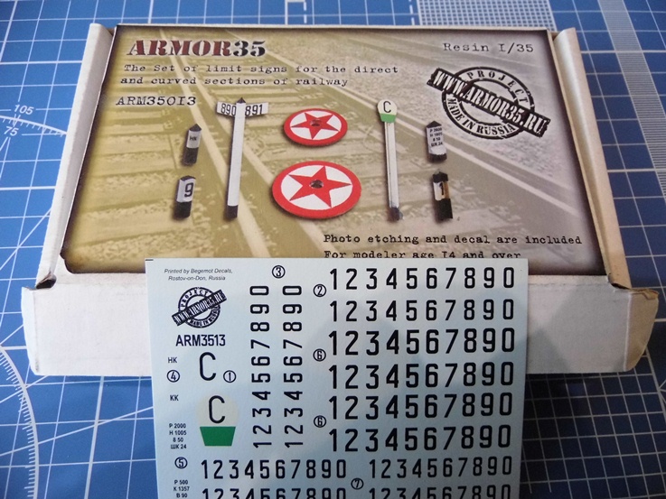 Есть набор, в котором километровый и пикетные столбы, знак "свисток", путевые знаки начала и конца кривой, а так же 2 розетки. В наборе идет пластинка травления и богатая на цифры декаль (которая может пригодиться и в другом), и еще несколько кусков рельс, как альтернатива столбам.