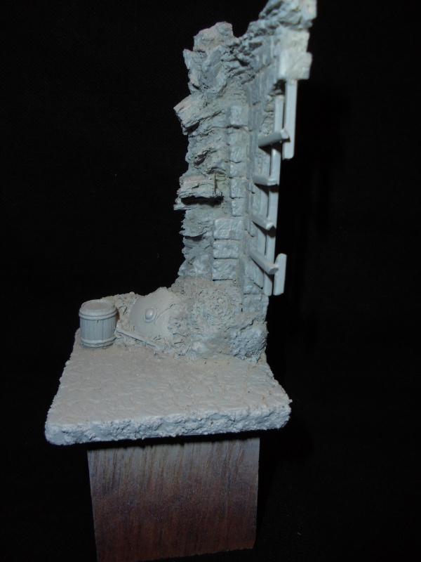.Для"ополченца" решил взять основание от"Black dog",надоели камушки с травкой.Основание собрал,зашпаклевал,швы прошелся разведенным на ПВА алебастром.Дал сутки просохнуть и задул из баллончика серым грунтом"Кудо" в два слоя,чтобы выровнить общую картину.Щит викингов пусть вас не смущает,он закроется всяким продовольственным скарбом.Сюжет-ополченец охраняет продовольственный обоз перед погрузкой и отправкой.Виньетку собираюсь делать в двух вариантах-один для"Кинотавра" с одинокой фигурой(так требует конкурс),второй- на"Оскара" с массовкой,спецэффектами и пр.Будут еще задействованы фигурки"Сталинград","Мантис"Продукты в различной таре(не помню какая фирма).Не знаю как это все поместится,но попробую.