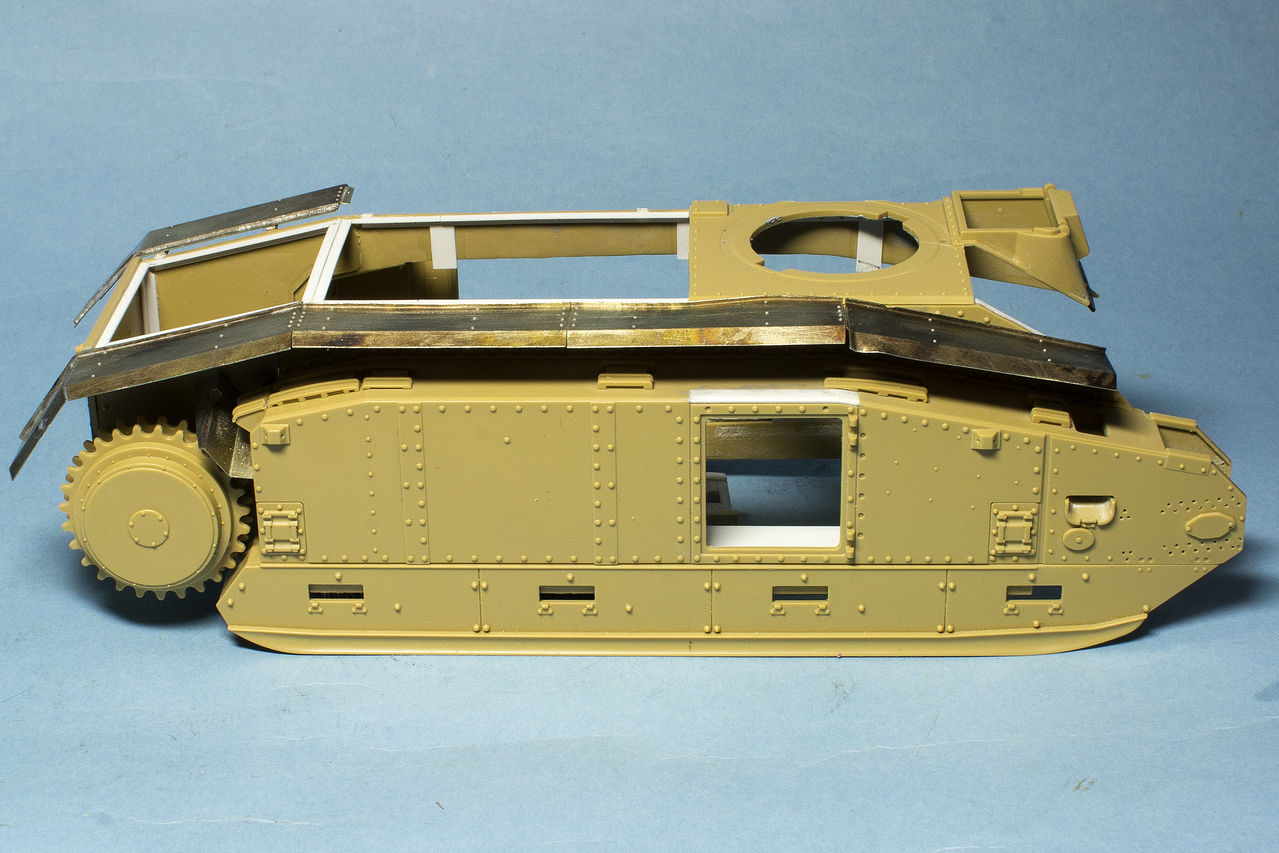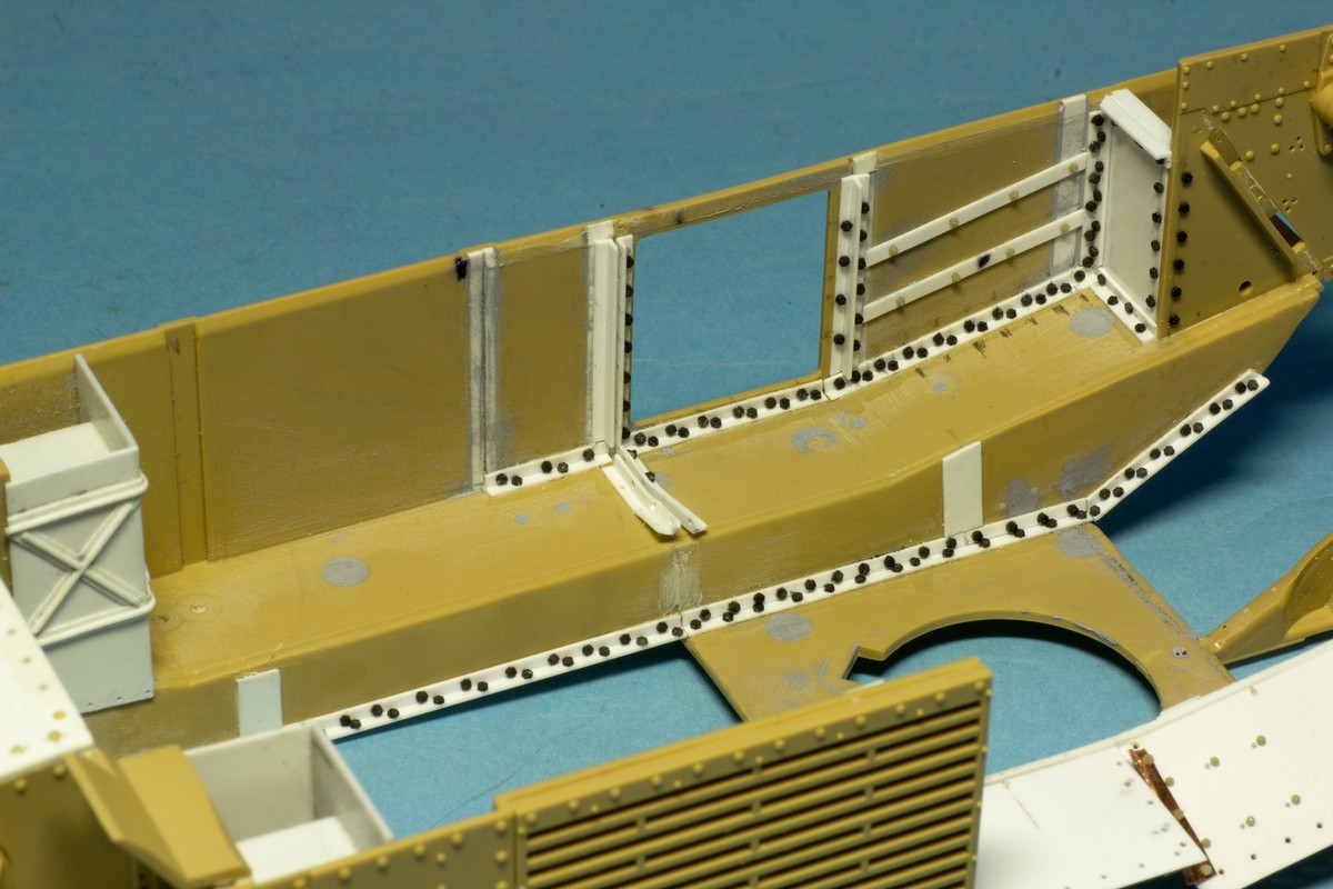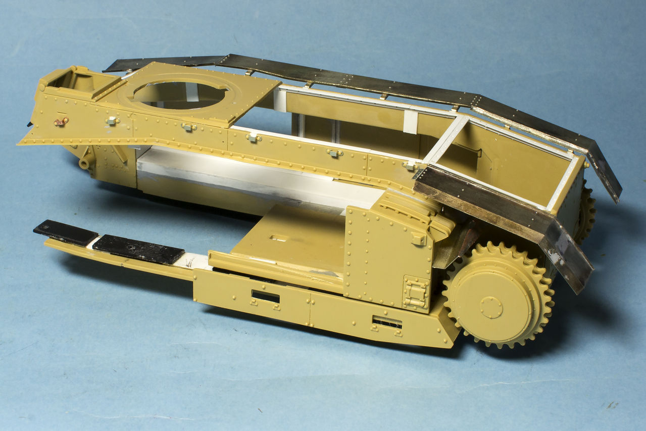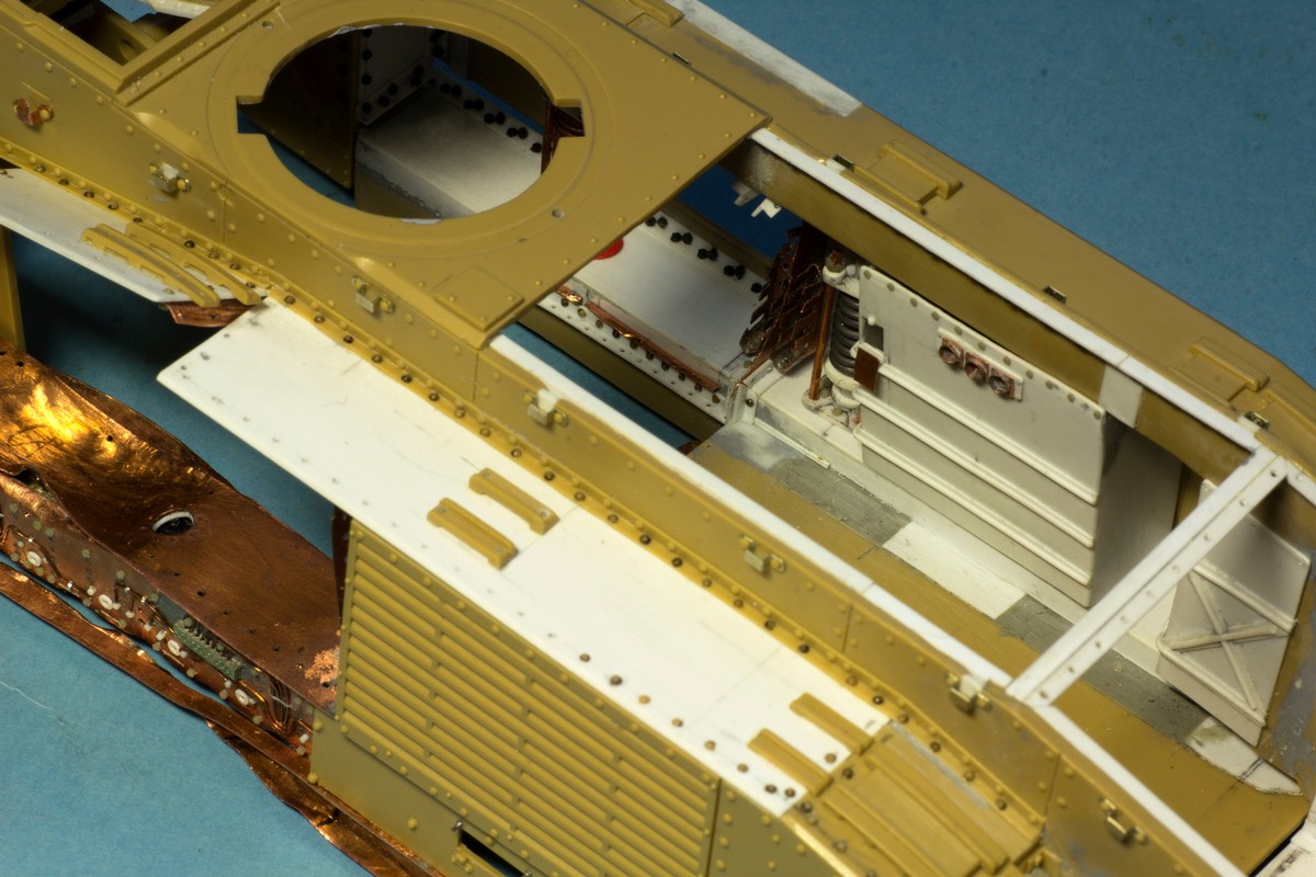 Теперь о французах... Сделал инсталляцию на правой внутренней стороне корпуса: остатки перегородки между БО и ДО, остатки кассет для 47 мм выстрелов, баки: два на правой стороне и один на левой. Теперь надо рассадить много-много болтов и гаек в внутри корпуса...