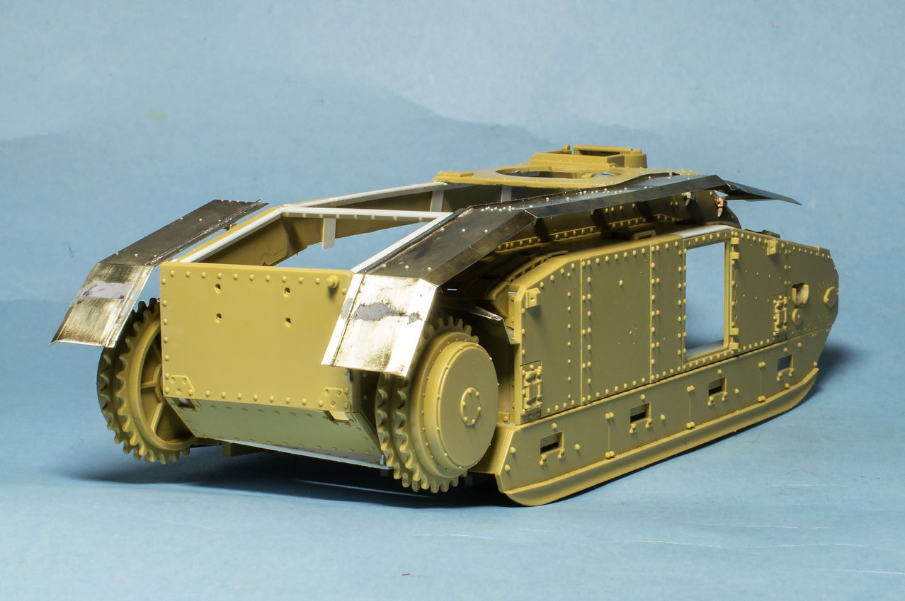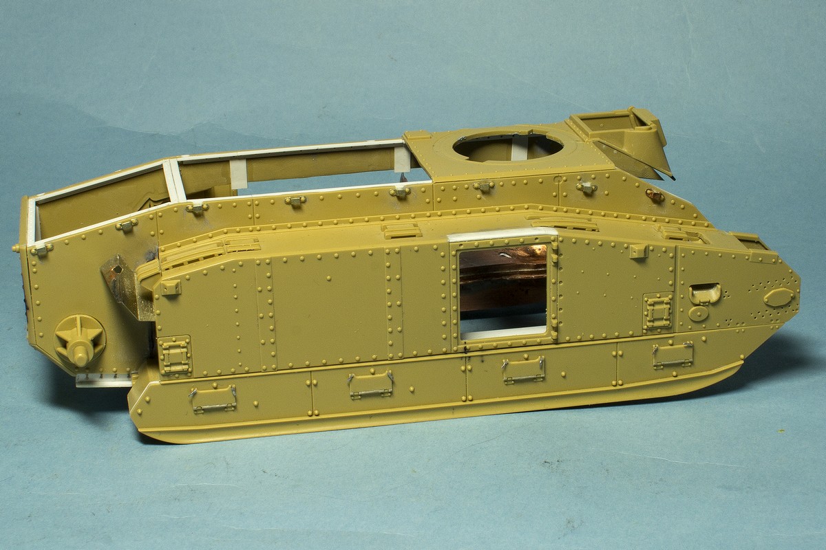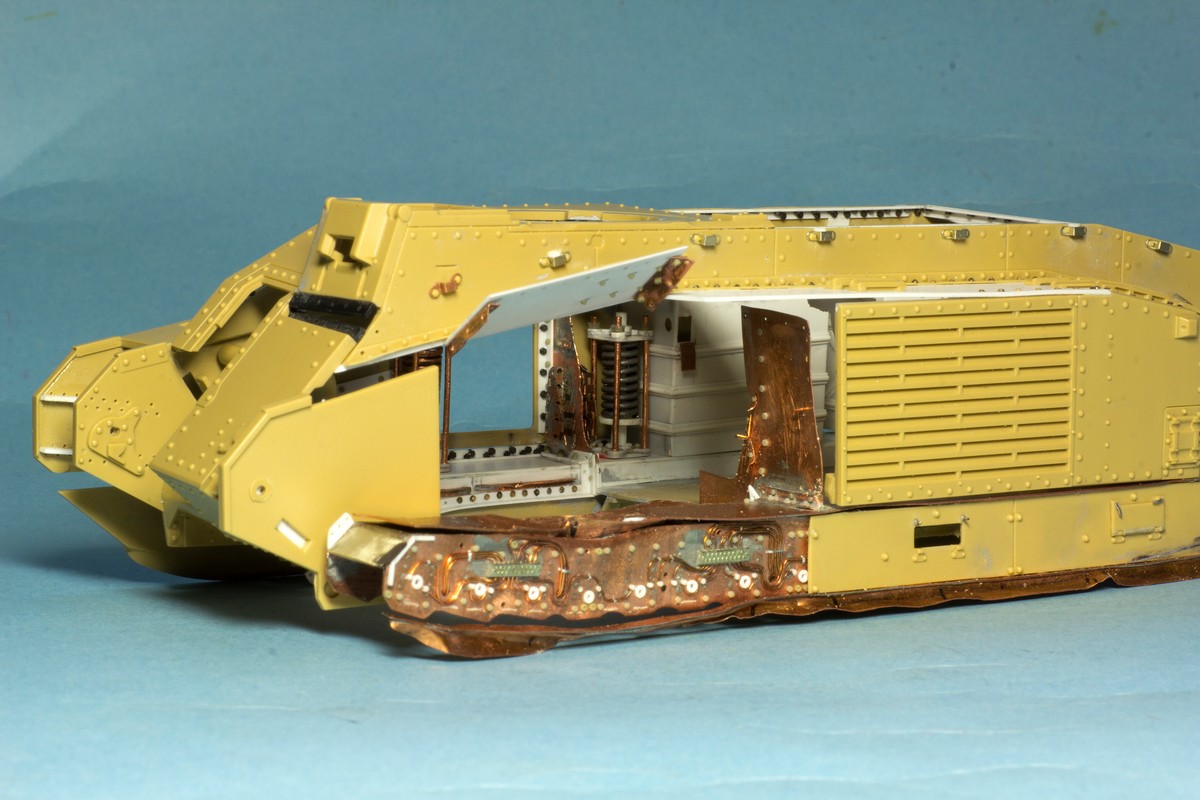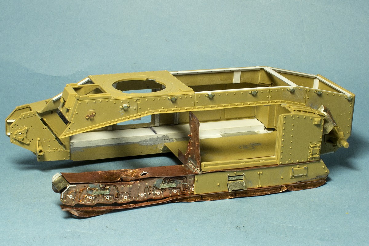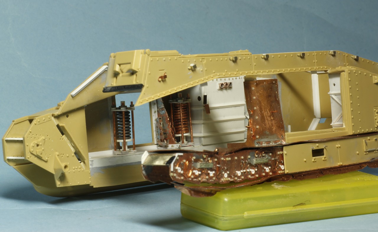 Теперь о французах... Сделал инсталляцию на правой внутренней стороне корпуса: остатки перегородки между БО и ДО, остатки кассет для 47 мм выстрелов, баки: два на правой стороне и один на левой. Теперь надо рассадить много-много болтов и гаек в внутри корпуса...
