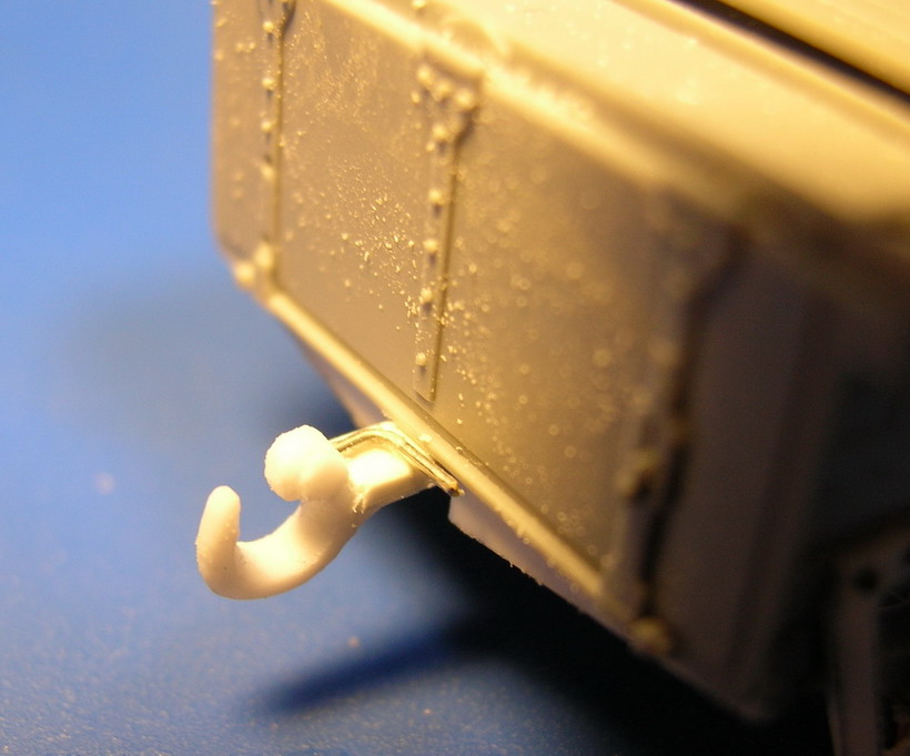 Я же сделал и установил боевую ось с креплениями. Ближе к хоботу приклеил снизу лист металла с кольцои для шворня передка. Кроме того там закреплены две проушины для установки гидралического компрессора (тормоза отката). Он ставился на орудия размещаемые на деревянных платформах. У меня же они будут только напоминать о подобной возможности. Ибо буду делать орудие с башмачными поясами на колёсах на 1914 г.