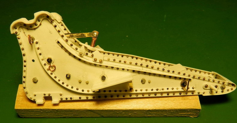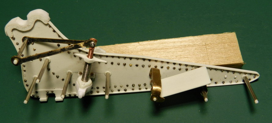 Немного отвлёкся на изготовление виньетки. Но добавил немного. Поставил в гнездо подъёмный механизм. На связующие попреречные "болты" надел тонкостенные трубки. Они служат ограничителями по ширине при сборке станин. Забыл ранее написать. Латунная изогнутая штуковина над подножкой, это подушка, на которую укладывается казённая часть орудия в походном положении.