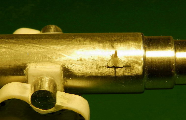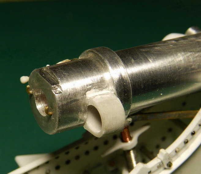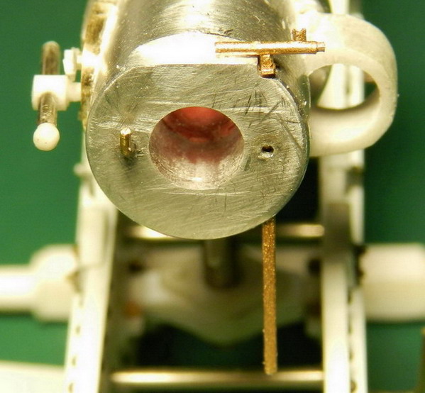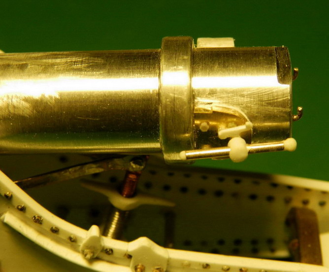Подошла очередь работы над стволом. Ствол выточил из дюраля.А вот детали пришлось делать из разных материалов. Цапфенные утолщения, прилив на казённой части под винт из полистирола. Клин затвора из смолы, а щеку затвора из латуни. Хотя можно тоже было из полистирола. Просто подзабыл, что из ьронзы они делались на чугунных стволах. А на стальных уже были стальные. И боковую мушку с правой стороны ствола поставил.