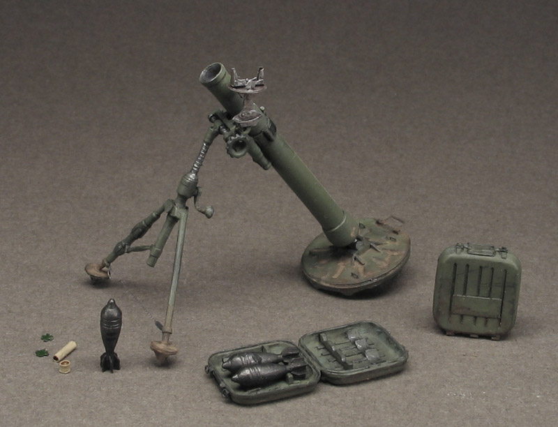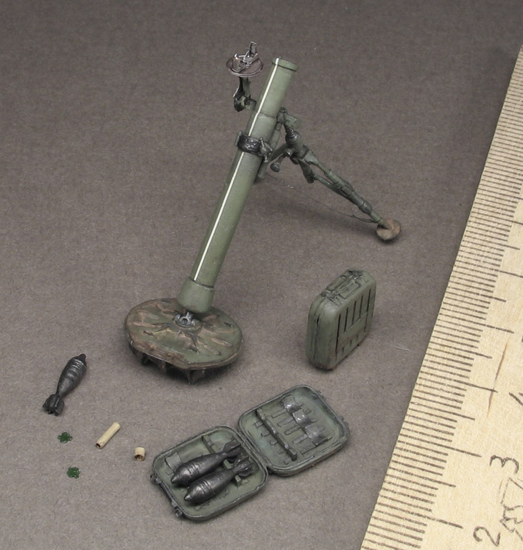Итак, только что закончил окраску миномета. Делал всё по-взрослому, как для большой техники - аэрограф, фильтры, выгорание краски, смывка, сколы, тертый графит для ощущения металла, пигменты. Сколами не стал увлекаться, на мой взгляд, количество и контрастность сколов используемых большинством моделистов при современной продвинутой тонировке излишни. Полосочка на стволе вырезана бритвочкой из старой авиационной декали и наклеяна на ПВА.