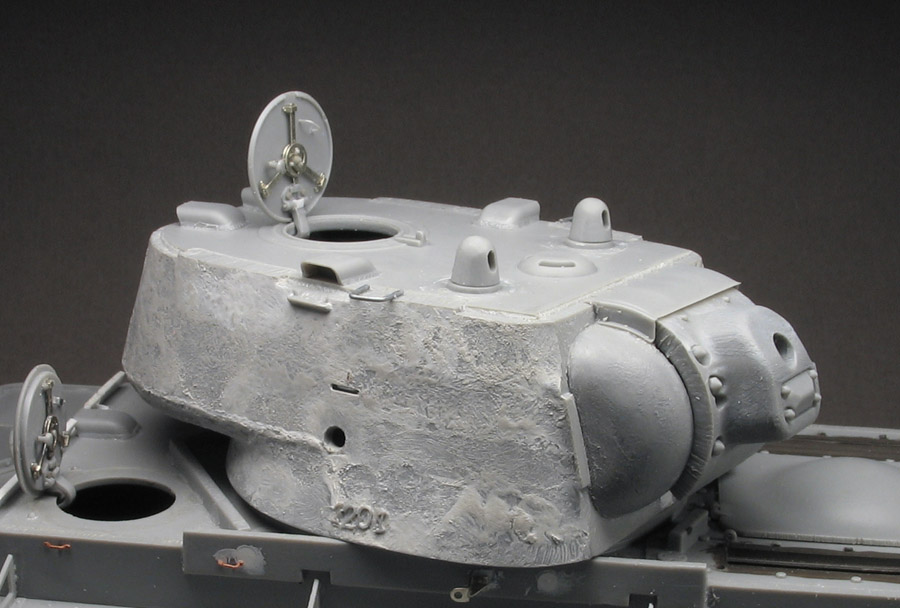 Фактуру литья имитировал белой тамиевской шпатлевкой из тюбика разболтанной в 646 растворителе и обрезанной жесткой кистью. Литевой номер на башне по фото прототипа.