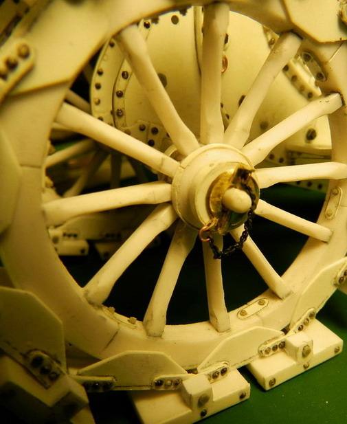 По накатанной схеме собрал колёса. Всё изготовлено из полистирола. Примерил на них башмачные пояса и покатал их по столу. Нормально шлёпают. Рядом для примера поставил фигурку пехотинца в 35 масштабе. Маловата будет. Придётся наверно от фигур отказываться, ибо крупнее у меня нет вообще.
