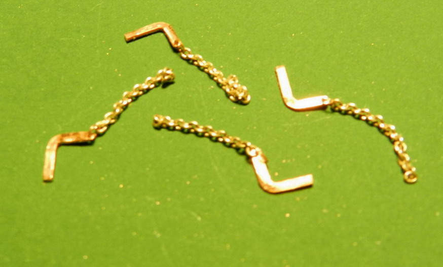 Ну а я сделал ещё несколько мелочей. Из латуни изготовил стопорную шайбу для колеса и чеки. Саму чеку тоже из латуни выточил, прицепил цепочки и примерил на ось.