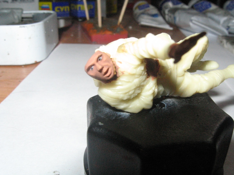 Алексей Гилевский, Красил акрилом "Валехо". А вот с кол-вом "проходов", даже и не знаю,врать не буду, все методом проб и ошибок. Взял средний тон телесного, потом оттенил углубления(разбавив светло коричневый с телесным), потом осветлил "верхушки",(добавив в телесный, белый) далее жидко разбавив и смешав телесный и светлосерый нанес небритость,ну и в завершении(чего нет на фото) добавил телесного смешанного с розовым на скулы и нос. Первая фигурка пошла в ящик с игрушками племяннику, так как нифига не получилось, сейчас вроде понял принцип работы с "валехо", вроде чего-то вырисовывается.