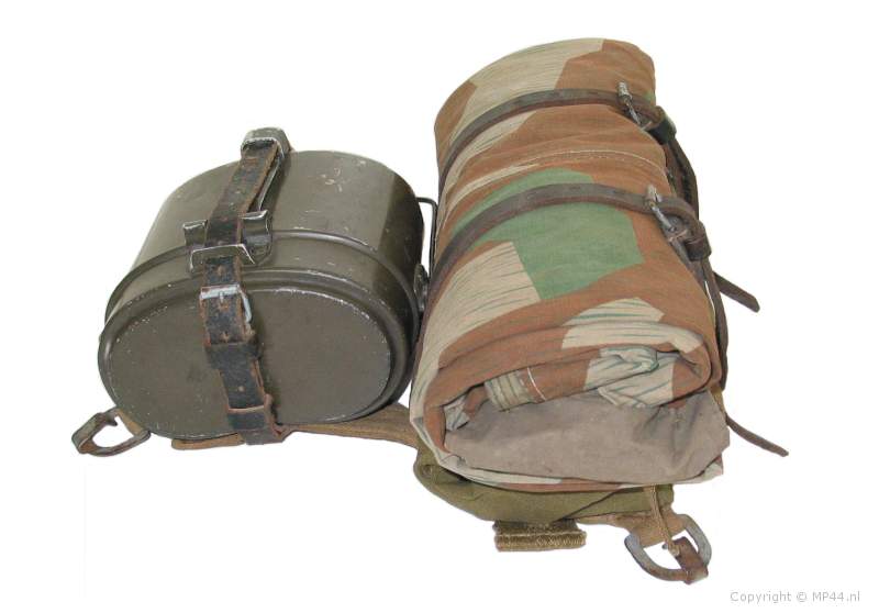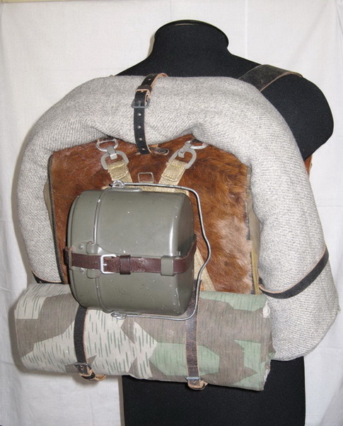Сверток плащ-палатки с двумя допниками висит в воздухе. В таком положении его просто не к чему пристегнуть на трапеции. В идеале, палатка должна как бы лежать поверх сумки ( которую из за этого, практически, не будет видно). Трапеция в оригинале достаточно маленькая. Ее высота в оригинале чуть больше 30-ти сантиметров и приторочить к ней три предмета как на фигуре : котелок ( кстати, интересный на данной фигуре – высокий, 2-х литровый обр. 1910г.) + сверток палатки + набитая всяким борохлом сумка – ОДИН ПОД ДРУГИМ очень проблематично.