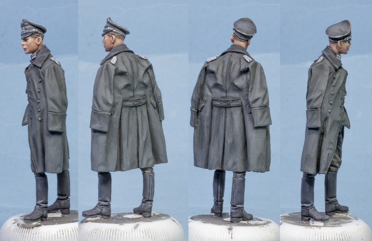 Шинель стоит выделить - она должна быть более зеленая, чем мундир.Воротник вполне уместно сделать темно-зеленым,а пуговицы белого металла. Для офицера с погонами минимум майора воротник мундира тоже бы в темно-зеленый перекрасить- такие мундиры до конца войны носили,особенно офицеры. Пуговицы на мундире даже если в защитной окраске, все равно по цвету должны от ткани отличаться.