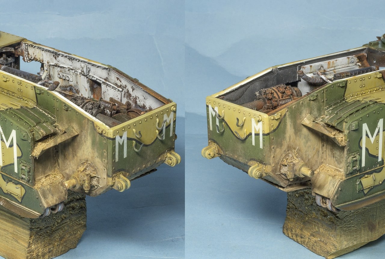 Как-то не получилось в феврале позаниматься танком. Все урывками и по чуть чуть. Пока замазал грязью пространство за ведущими колесами (масло + пигменты)