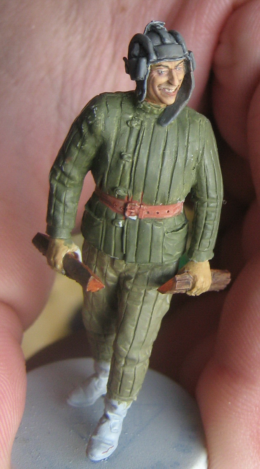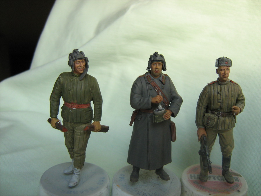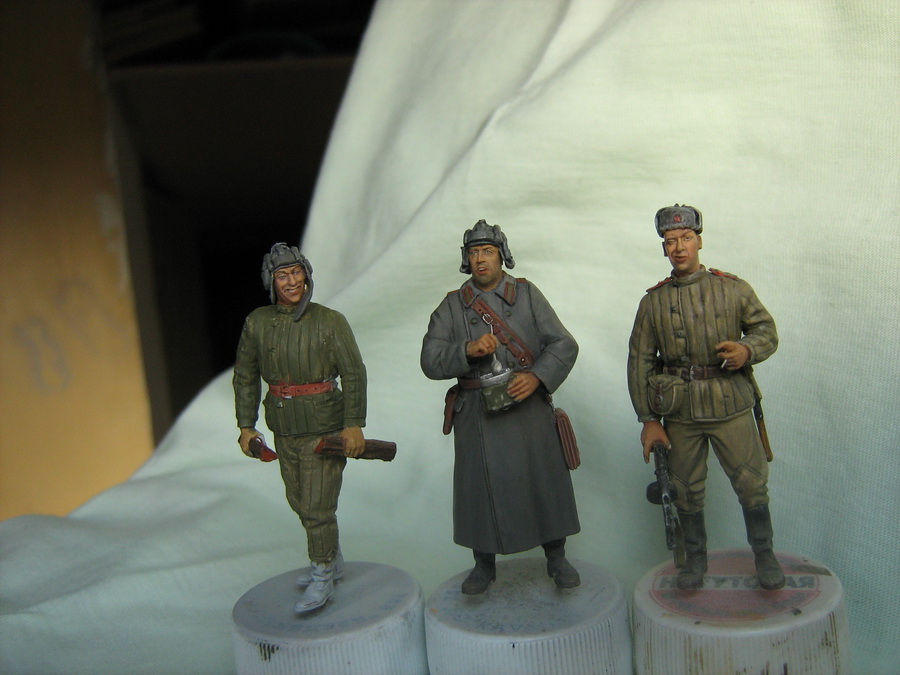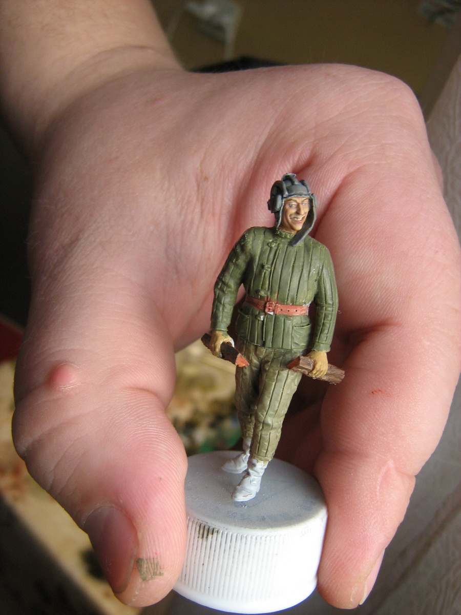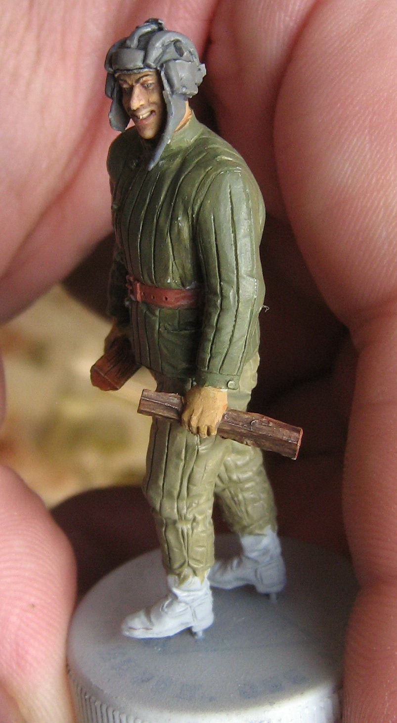 Открытого черного я стараюсь избегать.Получается очень резко.Можно промахнуться.Потом черный тяжело выбирать.А здесь шинель.Один сплошной серый(чёрный + белый).Я как мог разнёс и усложнил серый.Старался,чтобы серый цвет не слился в одну массу.А если глубокие тени нанести чёрным,то может получится очень контрастно.На данной поделке я переходы старался показать мягкими,а тени не активными.ИМХО
