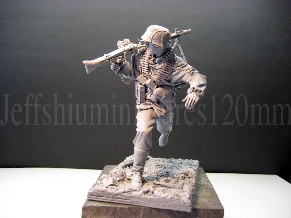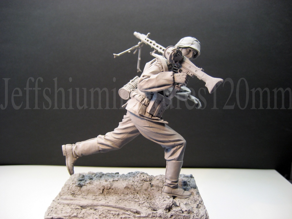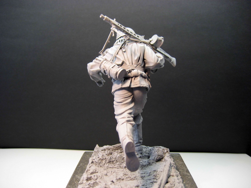 Добрый день, Константин! Если второму номеру дать в руки цинк с патронами, то придется каким-то образом немного опустить левое плечо (поза расслабленая, и если этого не сделать, то вес патронного короба "потеряется"). Лично я бы еще заменил ботинки с гамашами на сапоги и каску с чехлом поменял бы на обычную, гладкую, на мой взгляд такие мелочи удачно "прилепили" бы эти фигуры друг к другу. Но это всё дело личного предпочтения и вИдения композиции.