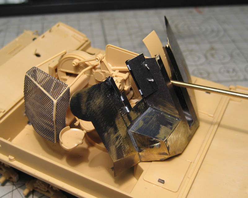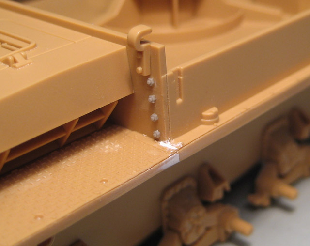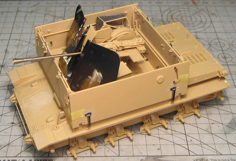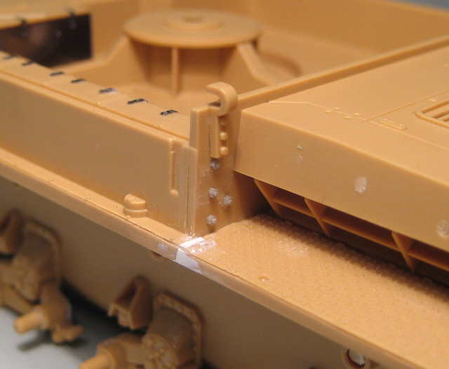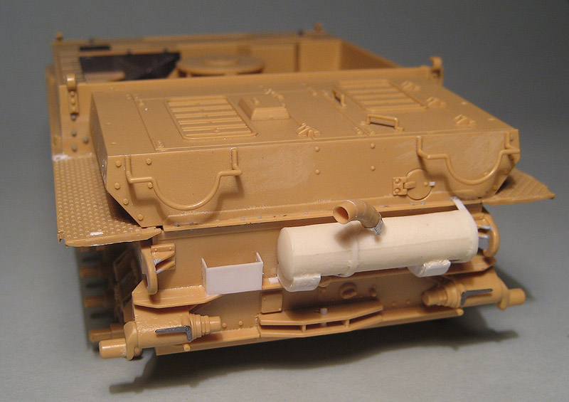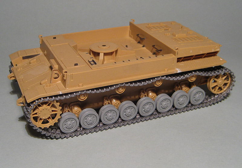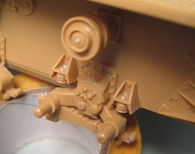 Осталось приклеить инструменты, предкрылки, глушитель и примерить траки. Они уже собраны. Катки тоже уже собраны.