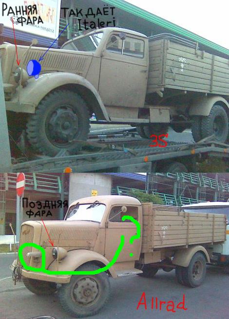 Night flight, К нужному какому масштабу? Вы забываете о перспективе, нельзя приводить масштаб по фотоизображению. На первом снимке 3 тонный полноприводный опель Аllrad 3,6S 6700A. Учитывая ракурс снимка и общий вид, накладывая его на реальный чертеж приведенный к масштабу фото получим, что на фото авто будет чуть выше и чуть короче. И чем ближе мы будем фотографировать тем больше будет величина искажения. На втором 1,5 тонный блиц, уже в третий раз напоминаю, он тут лишний
