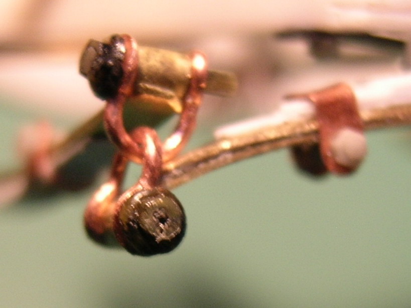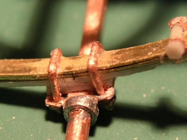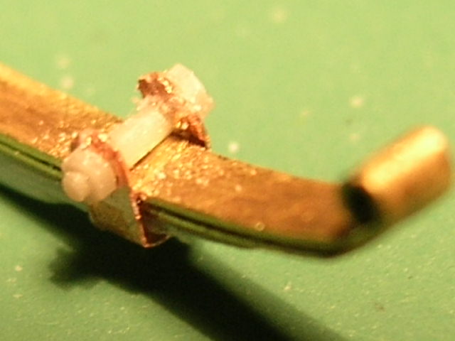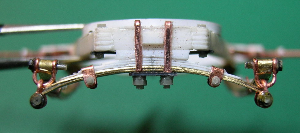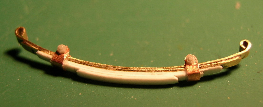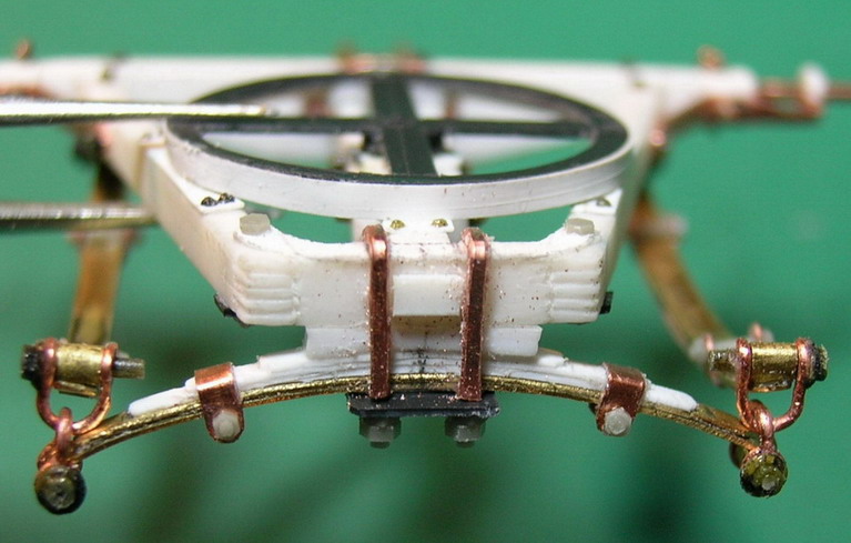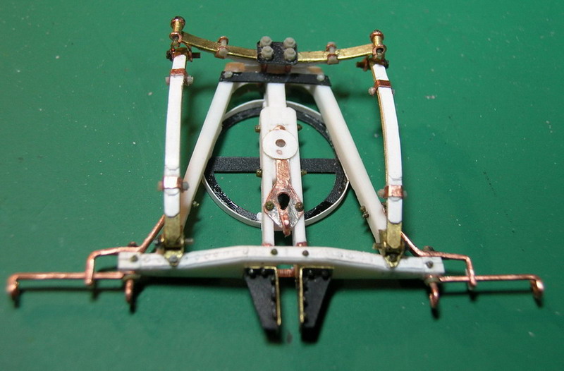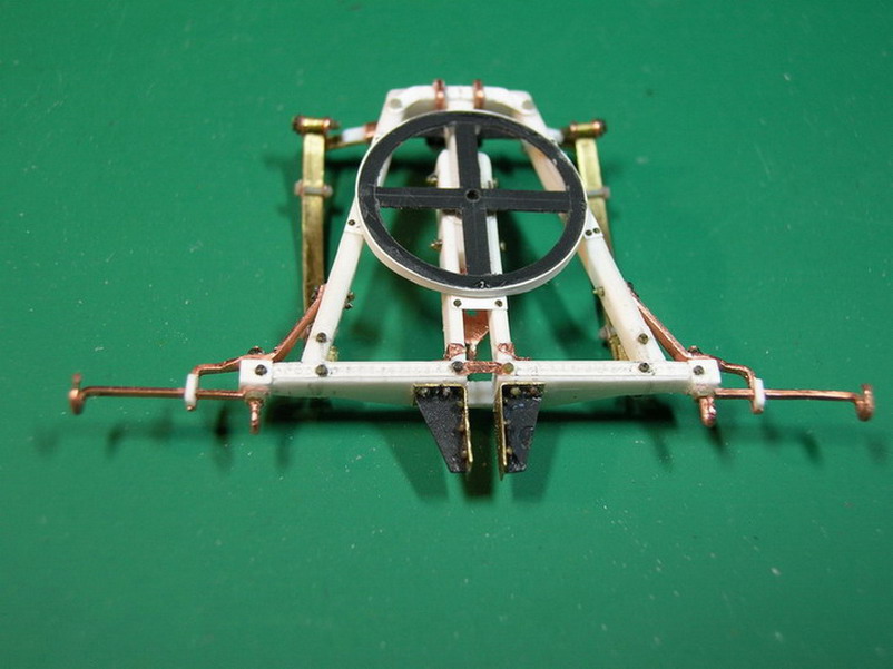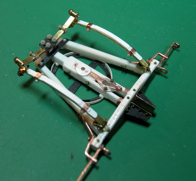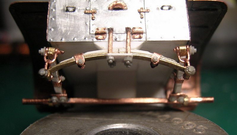 Итак продолжим. Из медной проволоки проковал оси и припаял к ним площадки для крепления продольных рессор.Собрал 6 рессор. Из полистирола склеил поворотный круг.