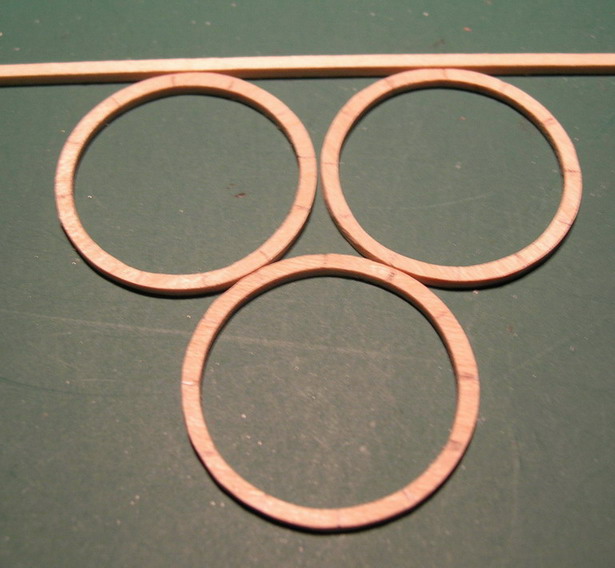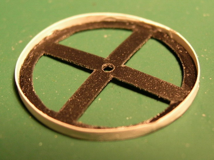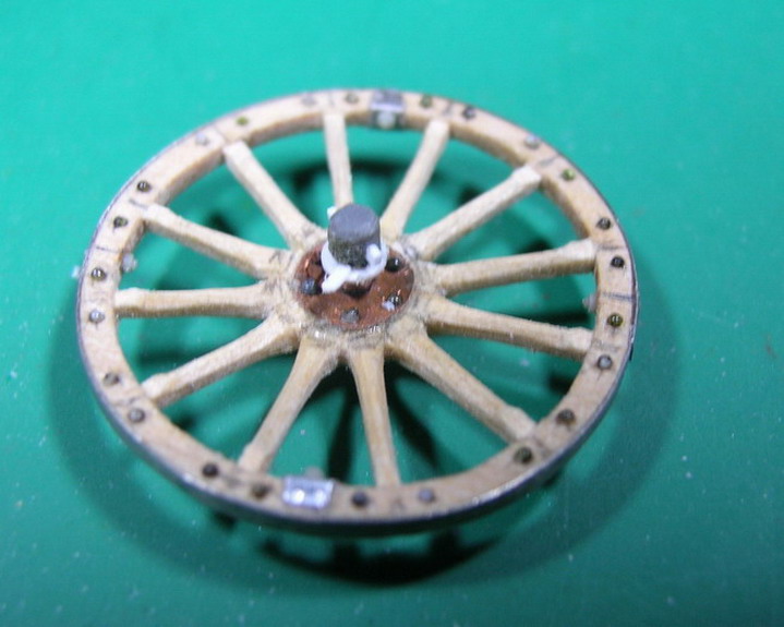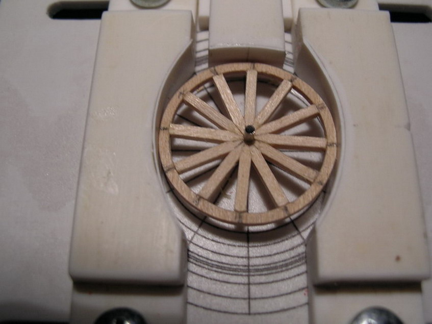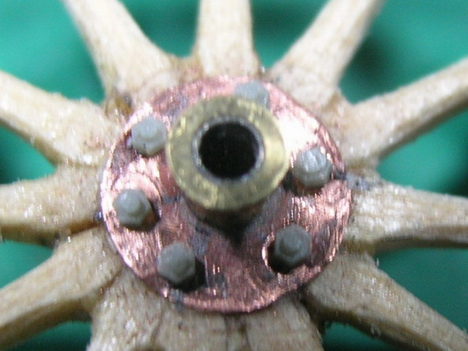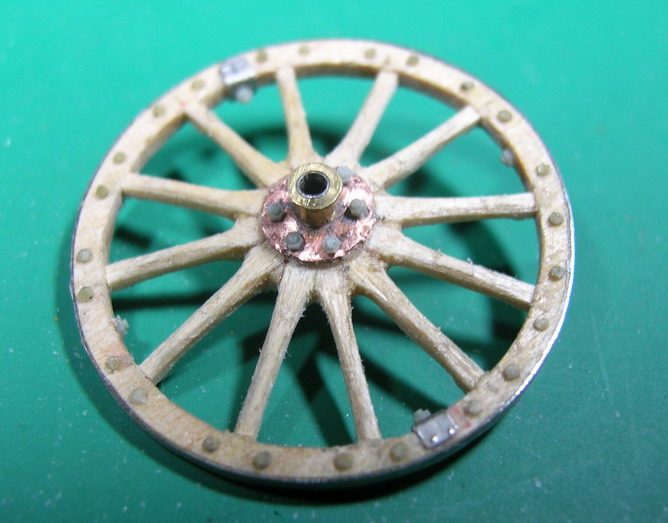 А теперь собственно о колёсах. Напилил их пластинок берёзы 4 обода и напилил лапши для изготовления спиц. Из медной фольги набил шайбы для ступиц, сами ступицы выточил из латуни. Сразу приклеил заднюю (корневую) шайбу. На неё будут укдадываться спицы. Ступицу ставлю на ось "стана", прижимами по диаметру выставляю и зажимаю обод. Под обод подкладываются пластины по размеру равные разнице по высоте между корнем ступицы и внутренней плоскостью обода. Ну и далее вклеиваю спицы. Затем приклеиваю переднюю шайбу, обрабатываю кромки спиц и.д. Получаю 4 колеса.