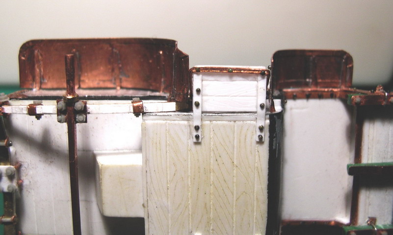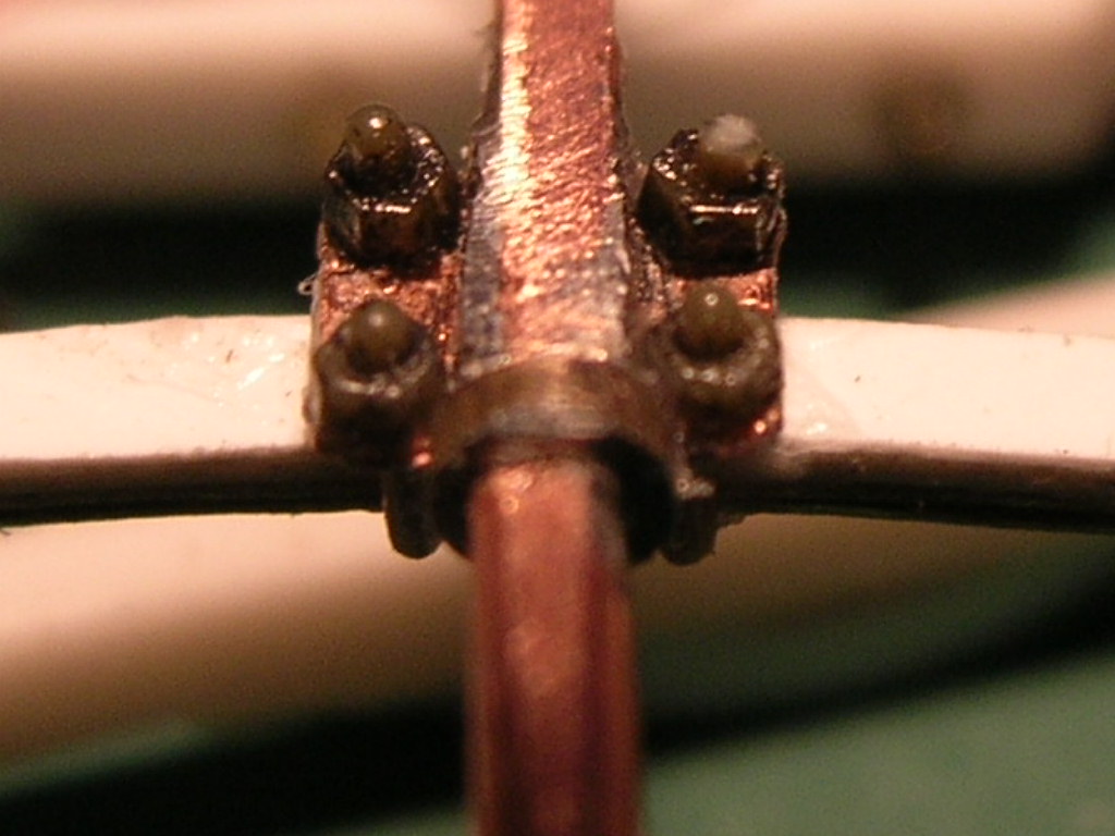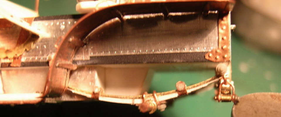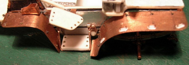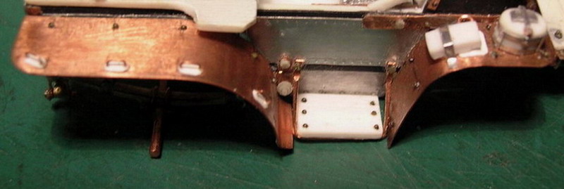 Спасибо Алесандр. Вчера вечерои и сегодня днём основательно поработал. Поставил ось и рессоры заднего хода. Из медной фольги согнул крылья и припаяв к ни кронштейны из медной проволоки установил на корпус. Подножки вырезал из полистирола и тоже установил на кронштейны из проволоки.На правом переднем крыле размещены маслёнка и тормозная колодка. С левой стороны над подножкой установлено откидное сиденье для заряжающего, уже по боевому. На крыльях также поставлены скобки для крепления брезента или маскировочонй сети.