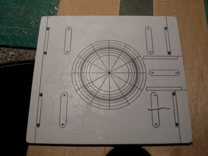 Продолжим мучение. Для начала показываю "стан" для сборки спицевых колёс. Сразу скажу, я не претендую на то, что это крайняя конструкция. Может кто придумает получше. Диаметры на основании начерчены с учётом основных диаметров колёс принятых в русской артиллерии. Иные можно делать подкладывая распечатку внизу.