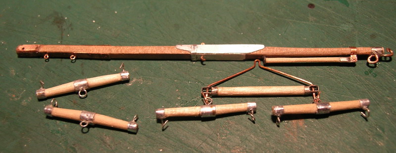 Ещё немного поработал. Отвлекался на Ф-22. Из берёзовых брусочков сделал комплектное разборное дышло, уносную вагу и 4 валька. Ну и собрал воедино 4 коробки для лент. Для установки их на правой строне.