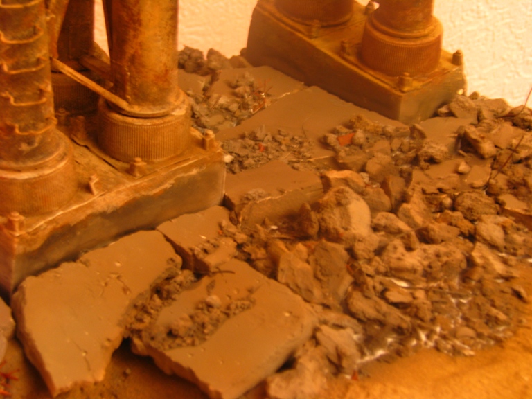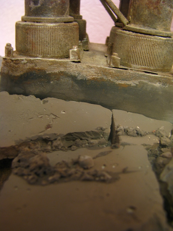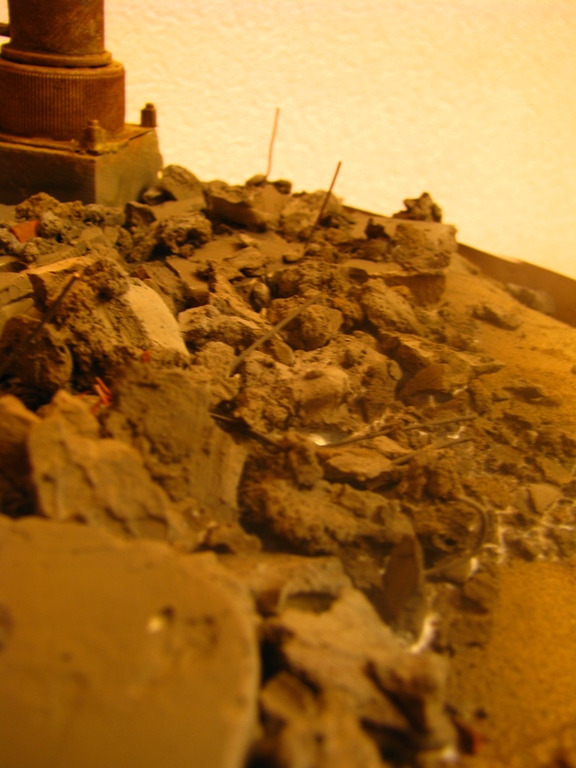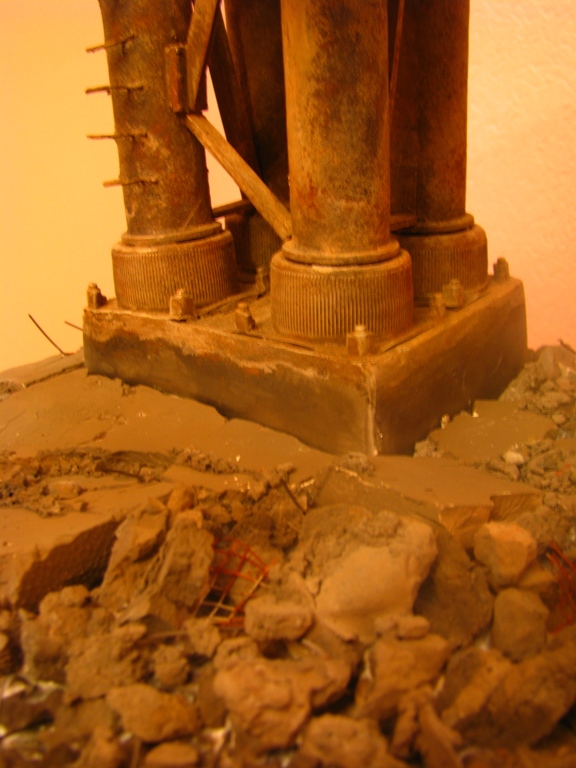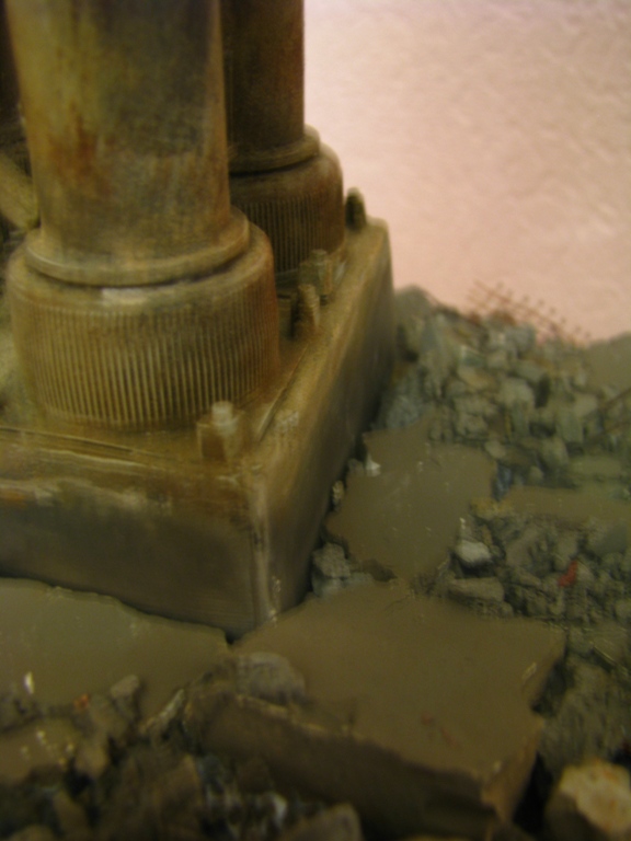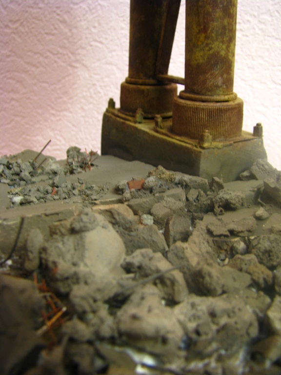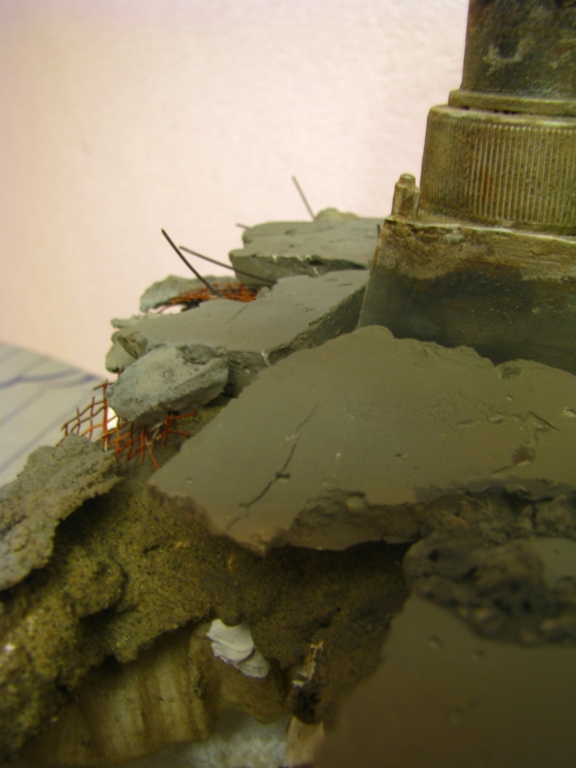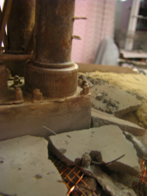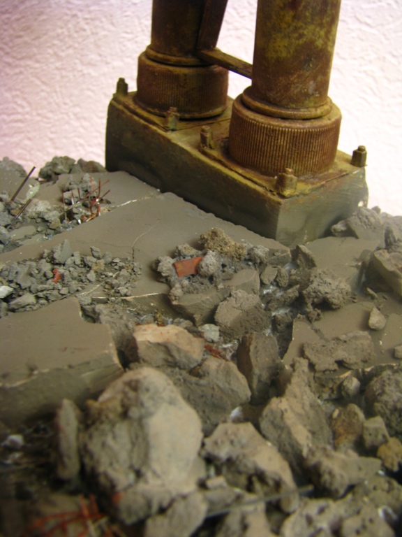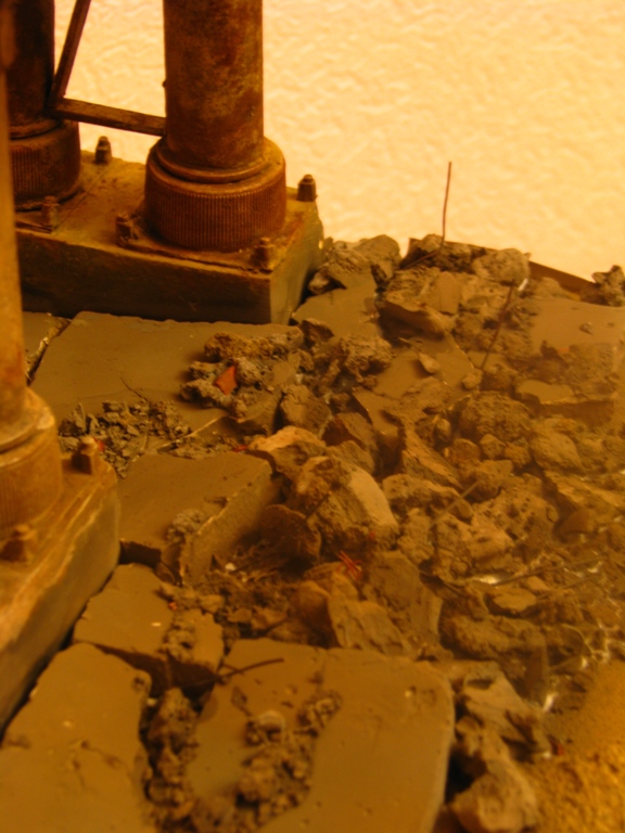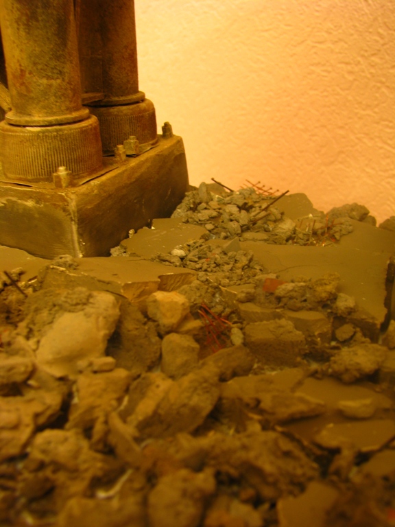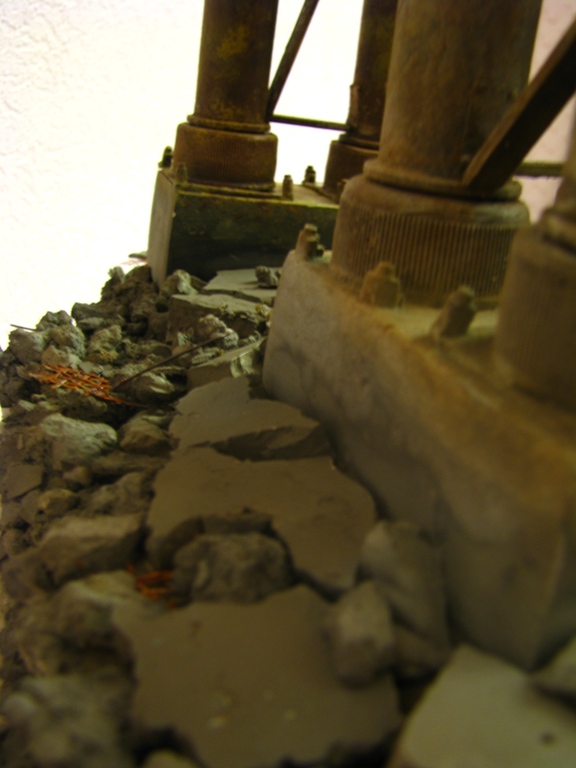 плитку и бетонные перекрытия разрушены взрывными волнами. задача показать расколотые блоки, куски арматуры и прочие прелести. фотал при разных установках. так что тона фото разные. подтеки белого - это еще не застывший клей ПВА.