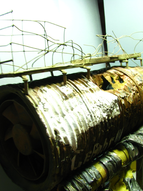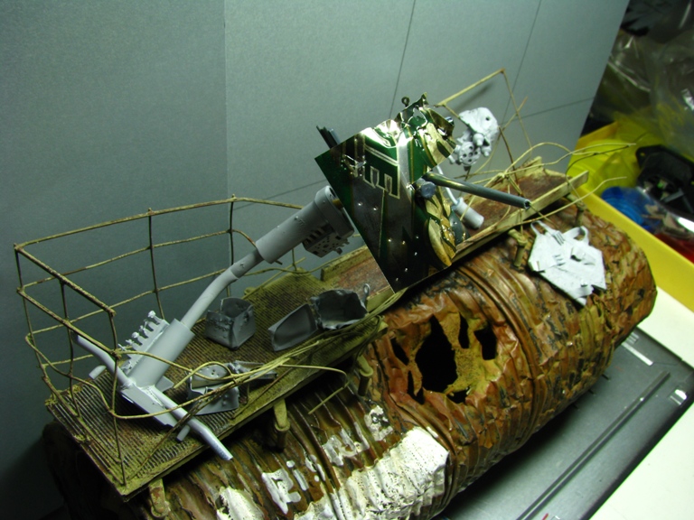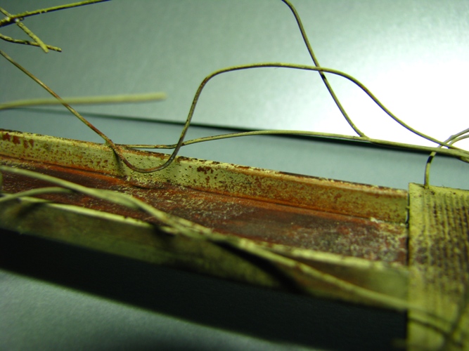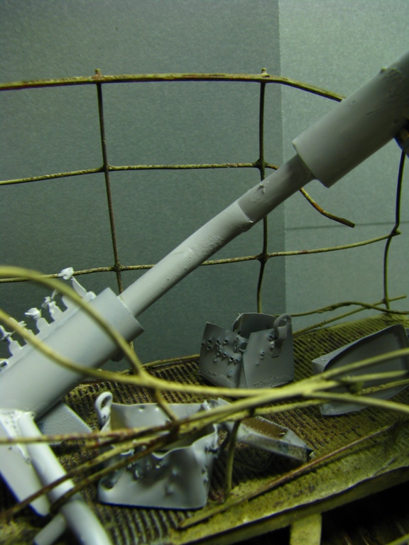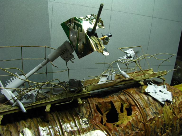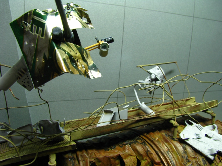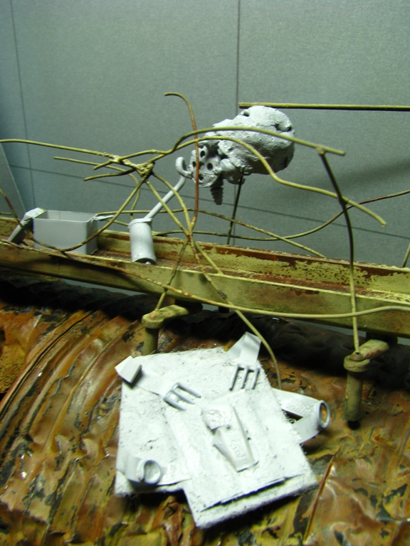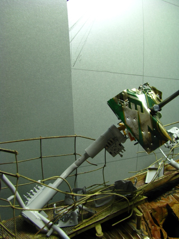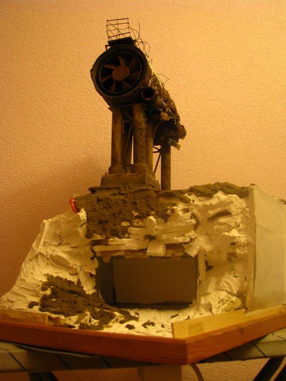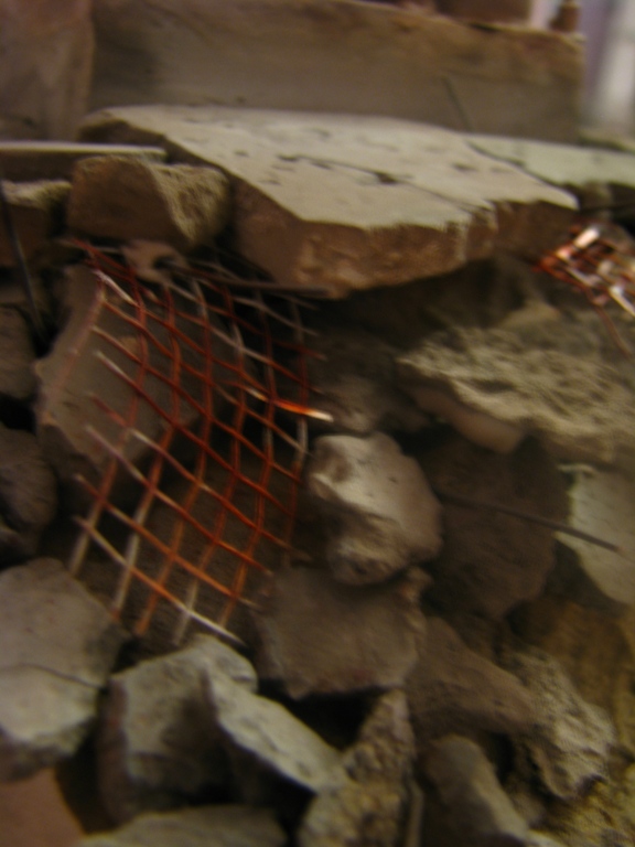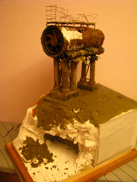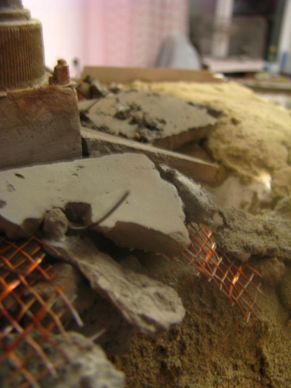 плитку и бетонные перекрытия разрушены взрывными волнами. задача показать расколотые блоки, куски арматуры и прочие прелести. фотал при разных установках. так что тона фото разные. подтеки белого - это еще не застывший клей ПВА.