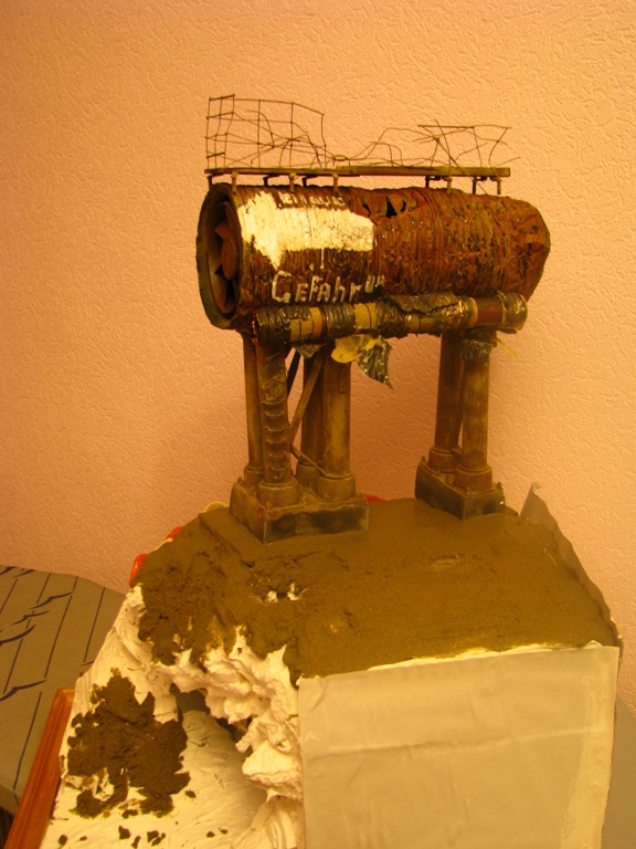 основание рамка от старой картины. заполнение - пенопласт. стороны основания для начала оклеены картоном. разместил трубопровод залил песком на ПВА.