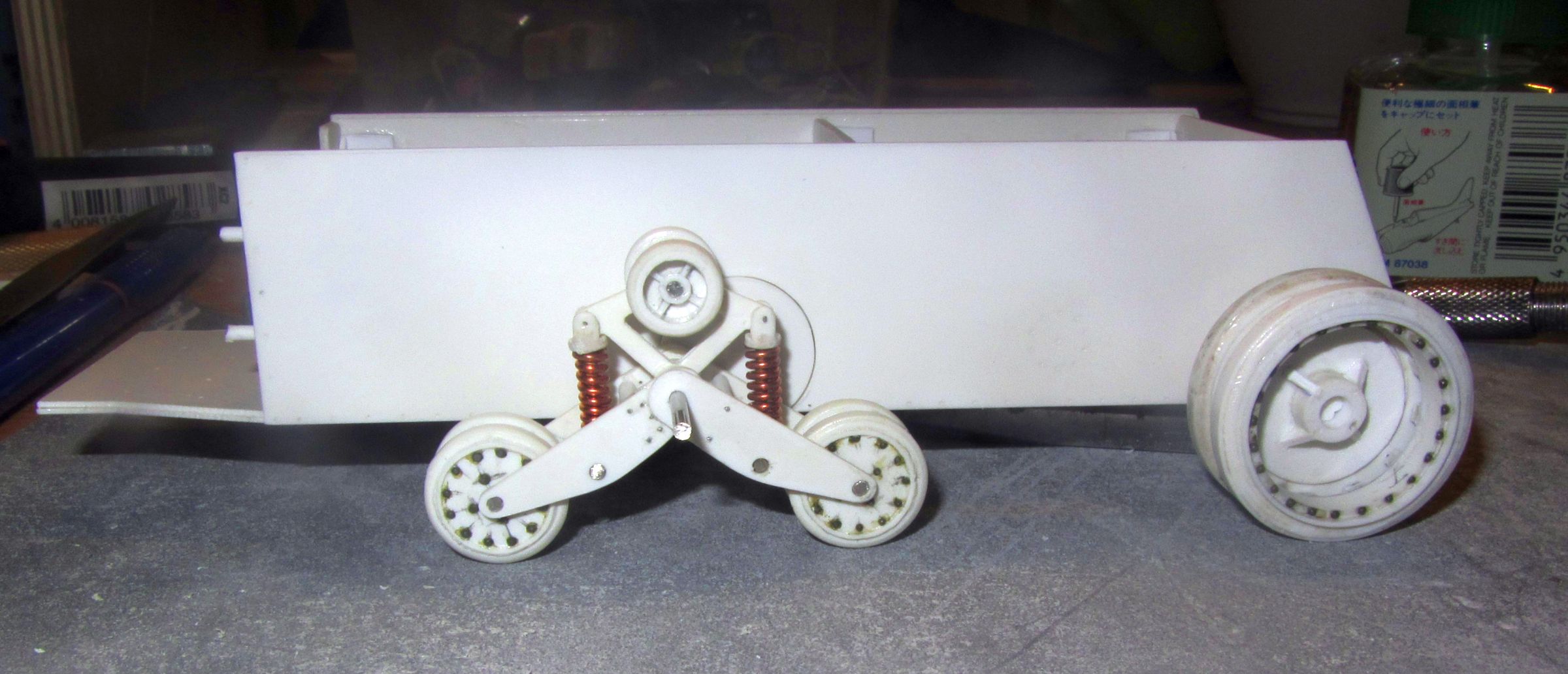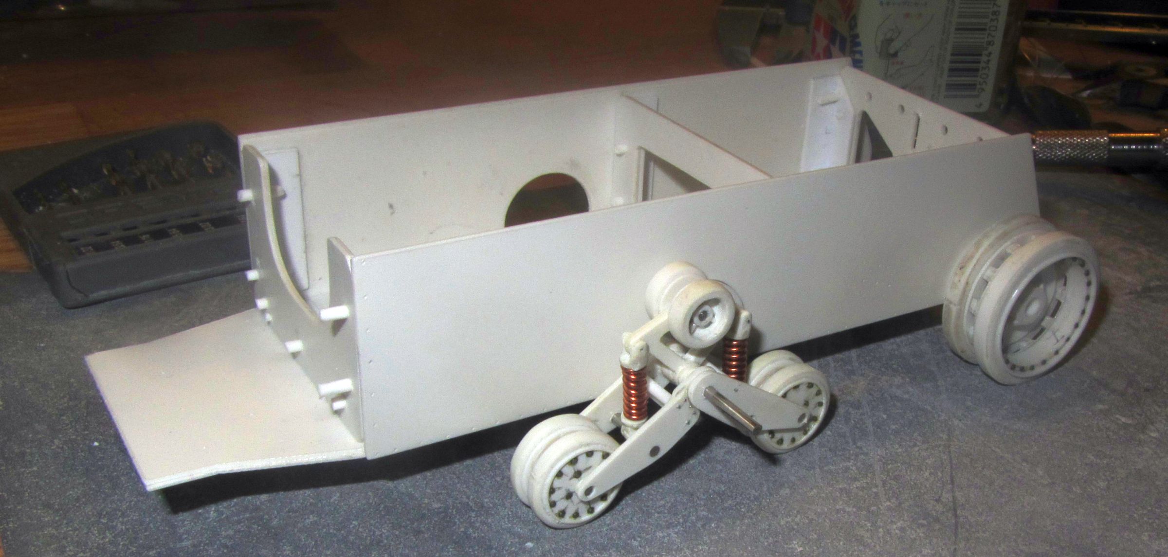 - доделать и приклеить полуоси задних колёс к кузову (бортам);