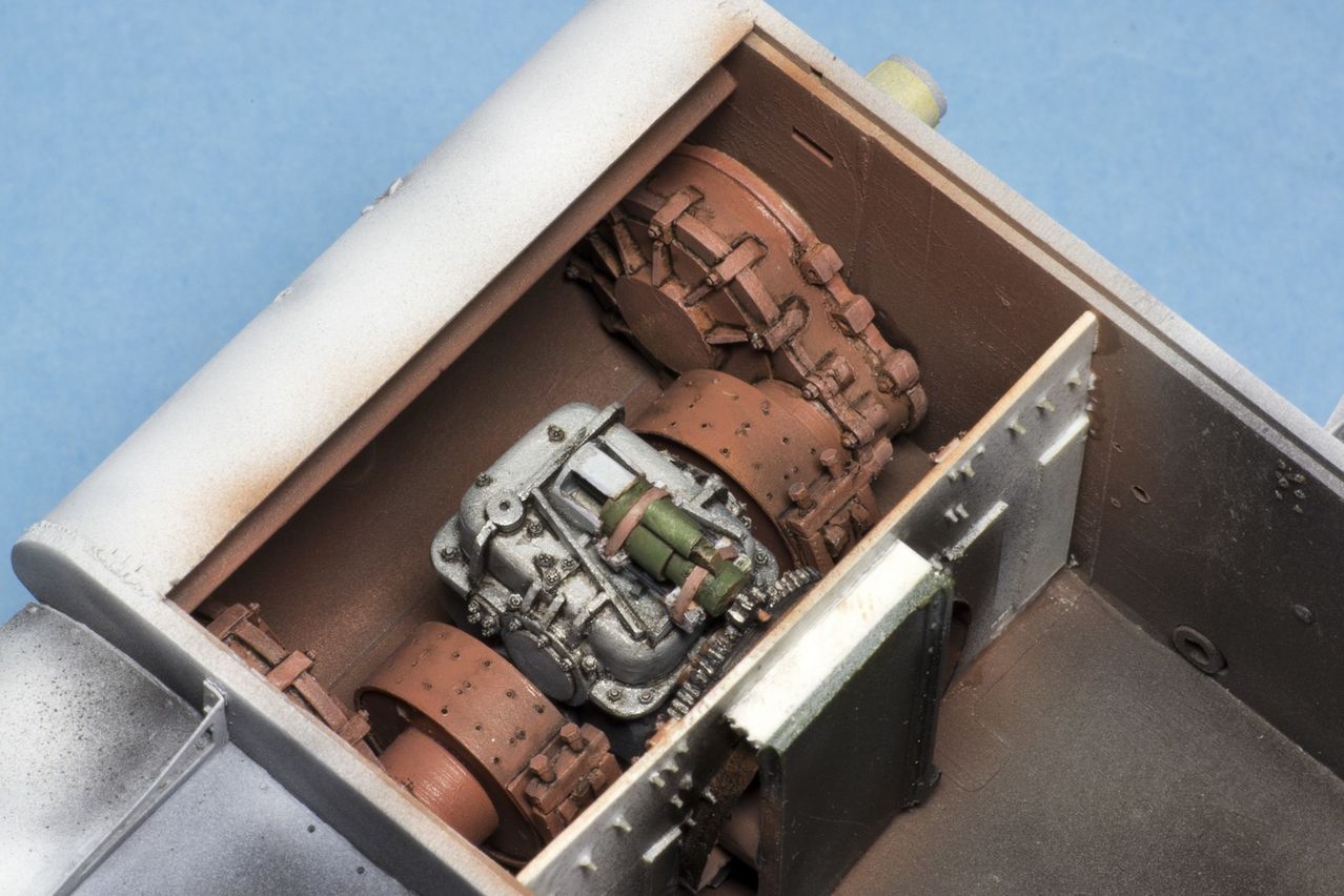 По совету Игоря сделал бачки для масла в трансмиссионном отделении. Получились не совсем копийно, но и видно то их чуть-чуть через люки...
