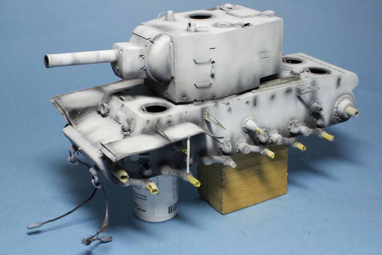 Сейчас тренирую руку на кошке в нанесении сколов и следов от осколков вокруг попаданий. В прототип в левую полку попало что-то осколочно-фугасное и весь левый бок башни иссечен радиальными бороздами от осколков. С первого раза нарисовать на кошке подобное не получилось