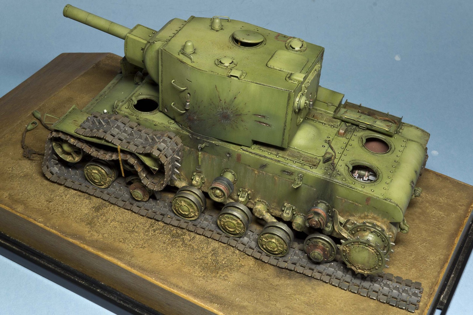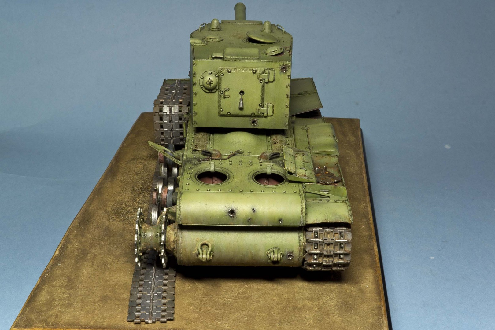 нарисовал сколы на башню. Танк был совершенно новым перед атакой на Остров и вряд ли успел насобирать сколов. Попытался только изобразить потертости на крыше от ног любопытсвующих после боя.
