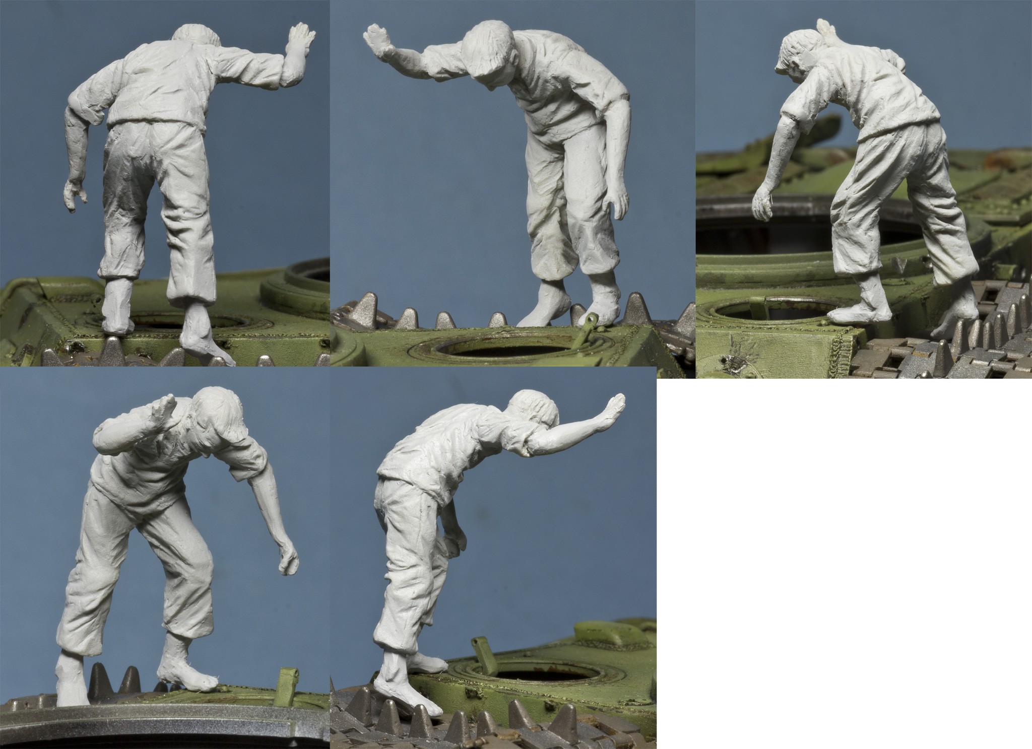 Я бы эту фигуру вообще убрал. Ни эмоционально, ни композиционно этот мальчик ничего не добавляет. На мой взгляд, если два других - это главные герои, не считая танка конечно, то третий второстепенный персонаж (массовка). После покраски в законченной работе он будет еще сильнее выбиваться по качеству от остальных фигур и особенно на фоне, настолько подробного и реалистичного в деталях и покраске танка. Проблемы не только в анатомии фигуры, но и в характере и проработке складок одежды, кистей рук, стоп, головы, а главное в неровности поверхностей, особенно открытых частей тела.