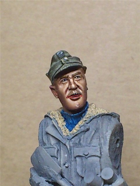 не стремлюсь передать мимику живого человека по той простой причине, что это - игрушка, солдатик, только дорогой. И она должна быть зрелищной.Нет. я мог бы, конечно в один цвет лицо покрасить, нарисовать глаза на нижнем веке, но зато реалистично изобразить верхнюю губу, которую, кстати, скульптор не слепил.
