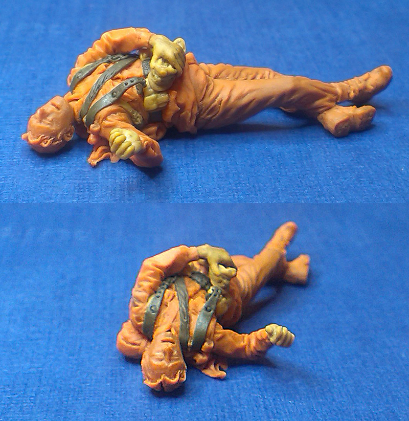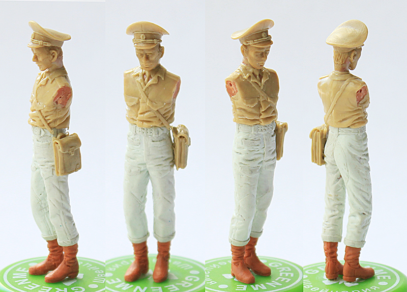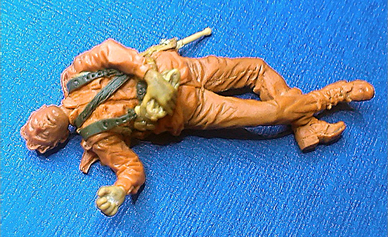 Попытка сделать ремни из зелёнки, кажется, удалась. Толщина ремня - 0,12 мм. После изготовления по выкройке всех деталей и их застывания, резиновость материала позволила придать снаряжению нужную форму и подогнать по месту. Патронные сумки, малая пехотная лопата, штык, кисти рук, кепи и скелет фигурки - из жёлтой Тамия, огромное спасибо Александру Зеленкову. Плечи попробовал сделать так, как он советовал в посте №5.