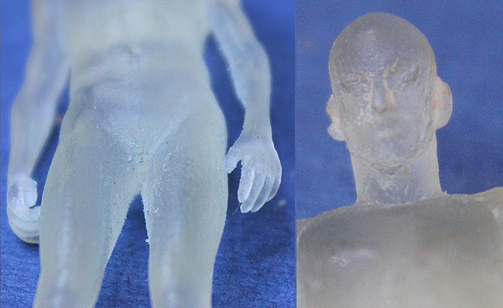 Сварганил 3D модельку. Перед тем как её одевать, чтобы не тратить времени понапрасну, попробовал вырастить. Высота фигурки - 50мм. Растили на Objet Eden 250. И разрешение у него хорошее, а качество получилось… То-ли не повезло, то-ли одно из двух… Первое – при печати фигурку положили на спину. Соответственно вся она пошла ступеньками в рост. Не удались уши, глаза, нос, рот...