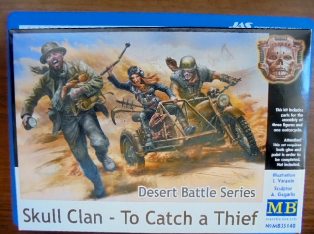 Пришла посылка с замечательной коробкой от Мастер Бокс.Бокс-арт впечатляет,на литниках все скромней.Но какое поле для росписи:все фактуры,все цвета.А какой визеринг можно забацать.Правда,придется подкупать травло на мотоцикл и тренироваться в лепке.Но новичкам советую.Сценку с жалкой породией на Паниковского я,конечно,уберу.Негоже убивать человека за сардельки из нефти.А вот маленькую канистру с бензином и логотипами байкерского братства добавлю.Да,и попробую осуществить свою идею с цветными тату.Да,очень понравилась поднятая пустынная пыль,надо попробовать это изобразить на виньетке.Но коробочка пока отодвигается на осень,надо закончить старое.Всем удачи!