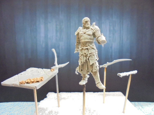 Опишу немного процесс создания миниатюры.Блог открывал,чтобы самому набираться опыта и помогать тем,кого посылают в Гугл.Фигурка известной фирмы"Андреа миниатюр" 54 мм.,белый металл.(родная).Для начала закрепил на деревянную подставку подставку от набора с деревом,приклеил отломленный(почему-то)сук.Замазал всю поверхность текстурным депозитом от"Wilder",цвет не важен,после высыхания дает красивую фактуру земли.Руки с древком не стал приклеивать,т.к. не удобно красить.После задул все детали серым грунтом"Кудо"из баллончика для метал. поверхностей.И тут ждала засада.То ли у баллончика закончился срок,может металл какой-то особый,но краска легла местами мелким зерном.Но я не расстроился,решил обратить себе в пользу.Видел как японцы,крася фэнтези,разводят специальный раствор шпаклевки и покрывают,чтобы кожа была шерховатой,пострашней.Поэтому,я местами зашкурил нулевкой,а местами оставил.Продолжение следует...