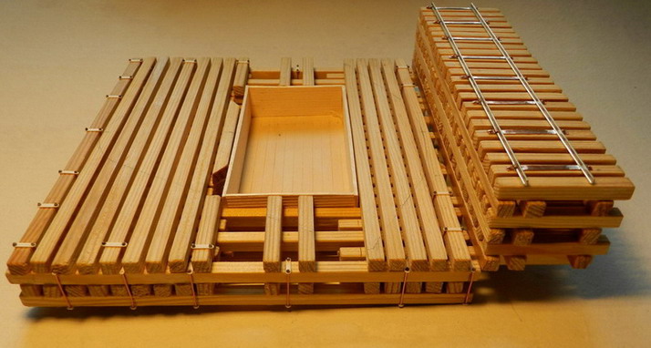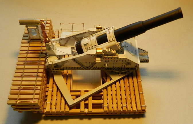 Наконец отмучился с деревянным основанием позиции. Брусья напилил из сосны. Склеил на ПВА и в некоторых местах скрепил гвоздиками. Симитировал болтовые соединения. Рельсы взял от узкоколейной ж.д. в М1:87.Рельсы могли бть или профилированные (как у меня) или в виде уголков. На шпалах могли лежать дугой )чаще уголковые) или прямо. На хронике есть оба варианта. Плеть сделал по типу крепостной ж.д. шириной 750 мм. Спаял рельсы между собой полосками из меди. Затем прикрепил на костыли к шпалам.