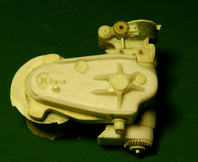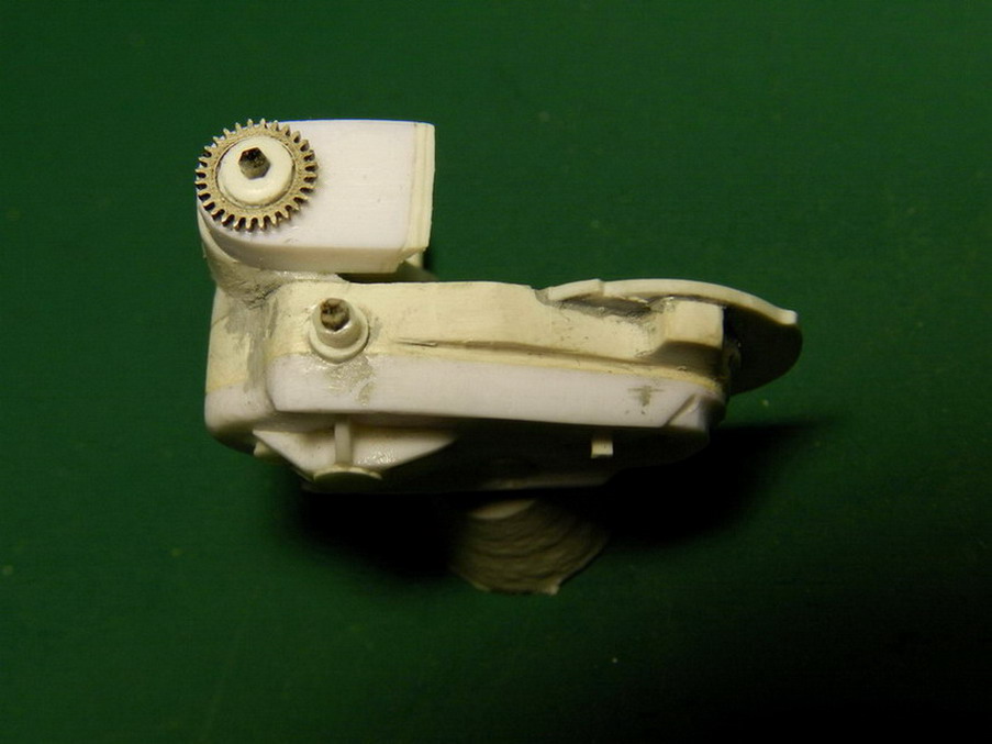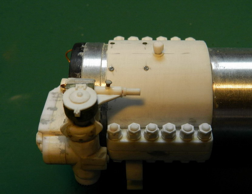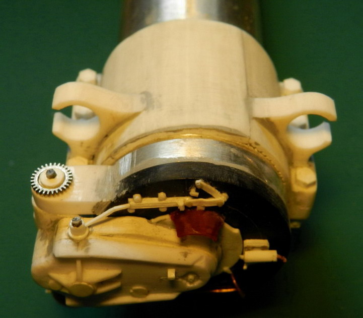 Продолжакю "нанизывать" детали на ствол. Вы уж меня извините, что я зачастую не знаю как правильно назвать детали или их назначение. Руководства то нет. На верхней части передней обоймы поставил стопорный болт и винты. На казённой части установил стпор для затвора в закрытом состоянии (сбоку) и стопор для открытого затвора. Снизу приклеил два кронштейна для цилиндров гидравлики.