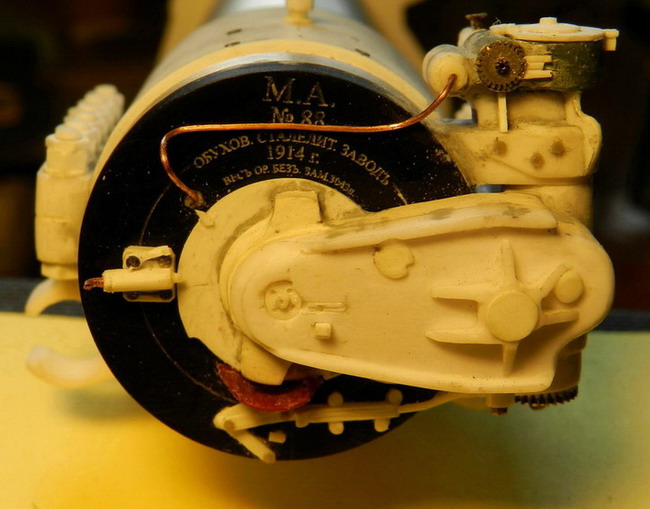 Пока ожидаю окраски начинаю новый большой проект. Может даже закончу его.305 мм. береговая пушка на открытой установке (журавле) из форта Красная Горка в Питере.Чертить начал ещё года 1,5 назад. Решил делать параллельно с чертежами. Ещё в прошлом году сделал "таблетку" на казённую часть с надписью. Делалось лазерной резкой. Для фото припудрил тальком. Выточил ствол из двух частей. Дюраль и эбонит. Приклеил нашлёпку сзади. Длина ствола, как видите 45 см. Масштаб 1:35