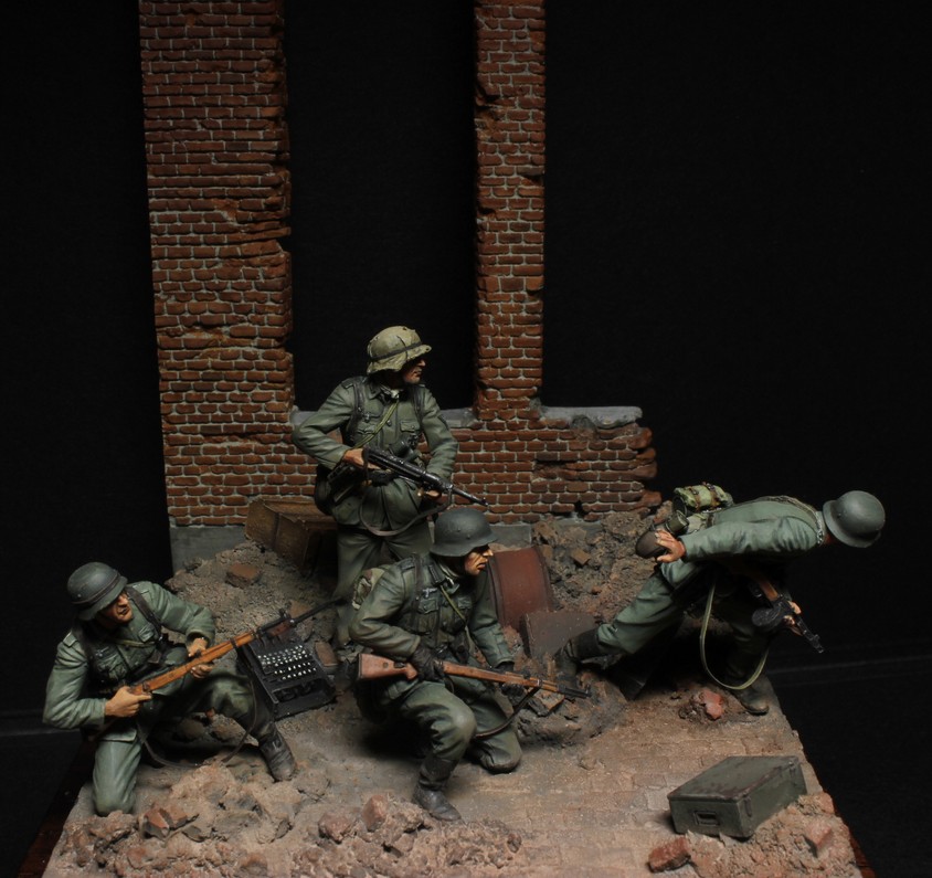 Михаил_Малинин Wrote:Всем привет! Наконец- то дошли руки скомпоновал бойцов вермахта на одной подставке. Идея - уличный бой лето (осень) 1942-го. Больше фото будет в галерее.