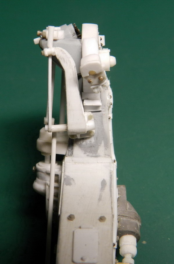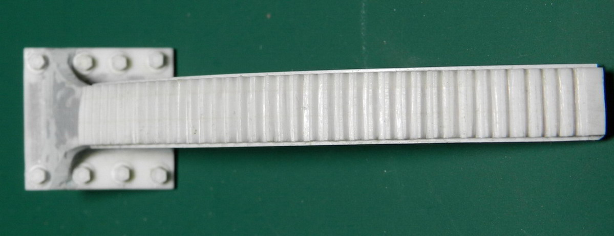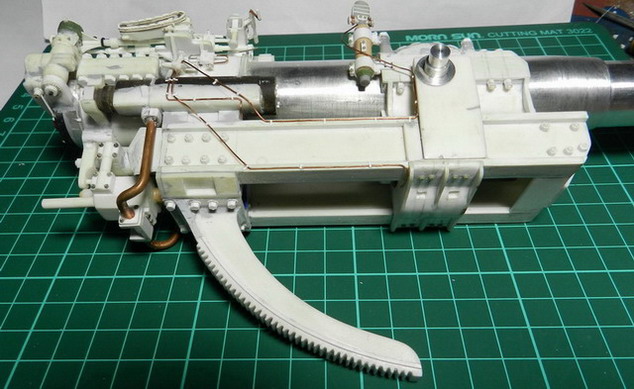 Изготовил сектор подъёмного механизма. Склеил трёхслоный бутерброт из полистирола, выпилил лобзиком. по разметке нарезал зубья, приклеил основание с болтами. Установил сектор в гнездо под казённой частью.