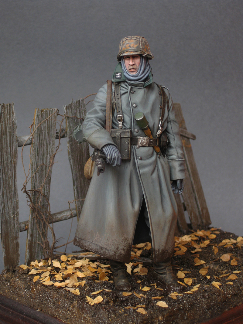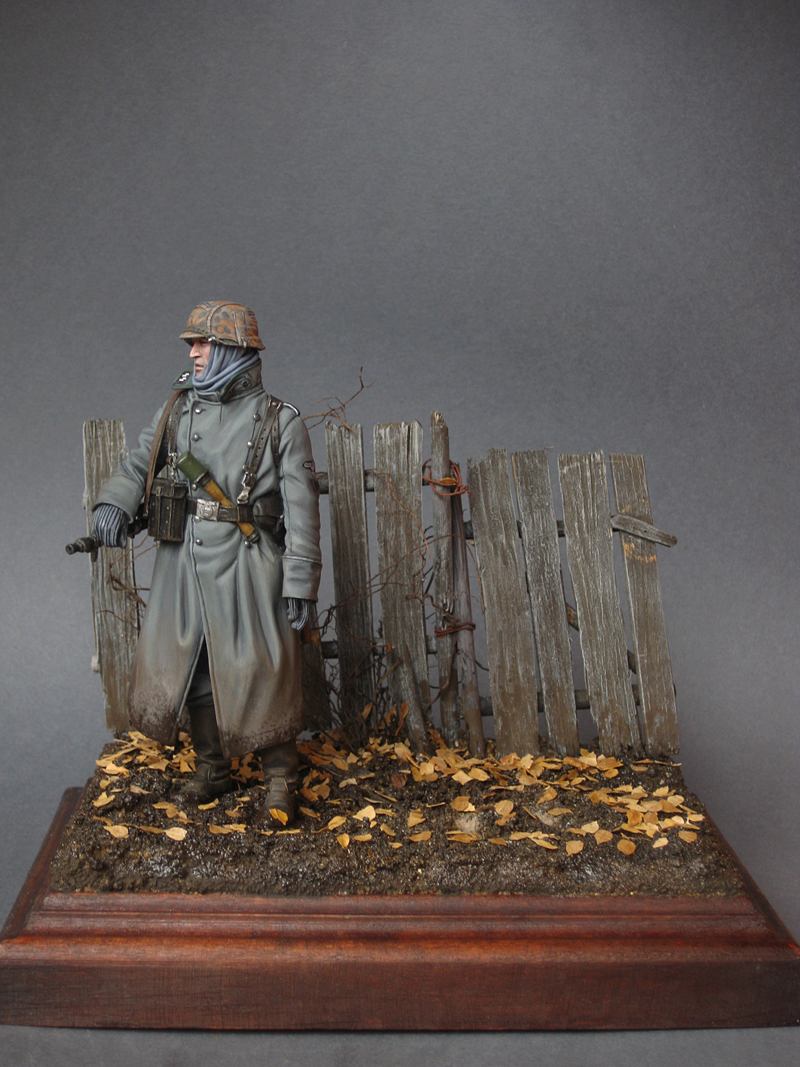 -=BaNaNaFT=- ,Здесь нужно рассуждать логически. 1)вариант - Листва могла уже почти вся осыпаться. Немцы прошлись по грязи вперемешку с листвой. Естественно листья могут прилипнуть только к сапогам. 2) Вариант - они только что вышли из густого леса/кустарника и решили передохнуть, тогда можно напихать много листьев(от разных деревьев, а не только желтые от одного)в те места, где они могут зацепится, накопится и т.д. 3) Вариант(романтический) два друга стоят под деревом (не попало на диораму) в самый пик листопада. Можно поверх них красиво разложить листочки.