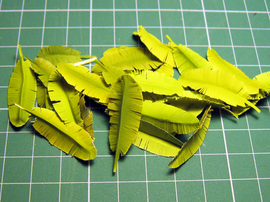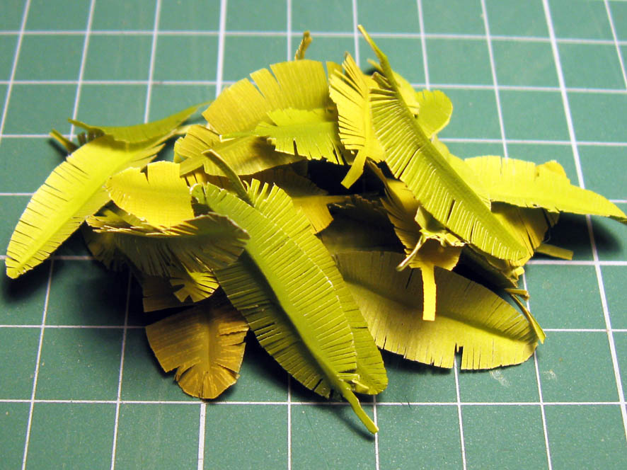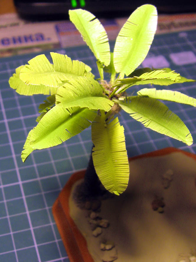 Далее делаем эдакий "бутерброт"- сначала приклеиваем кусочек полоски к проволоке на верхушке пальмы (не забываем отрезать лишнюю проволоку). После этого, к этим двум деталям приклееваем сам листик.