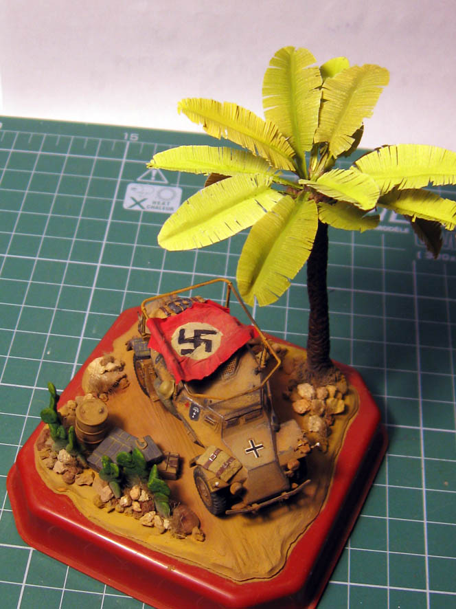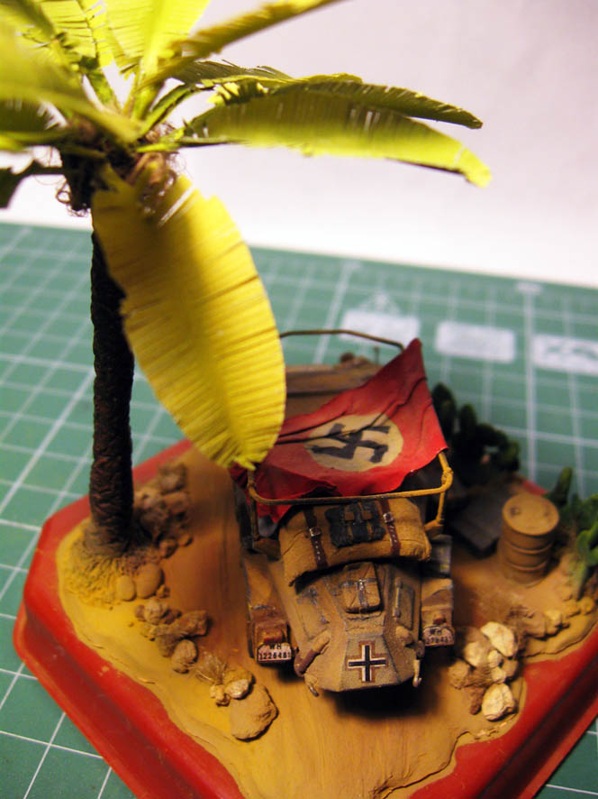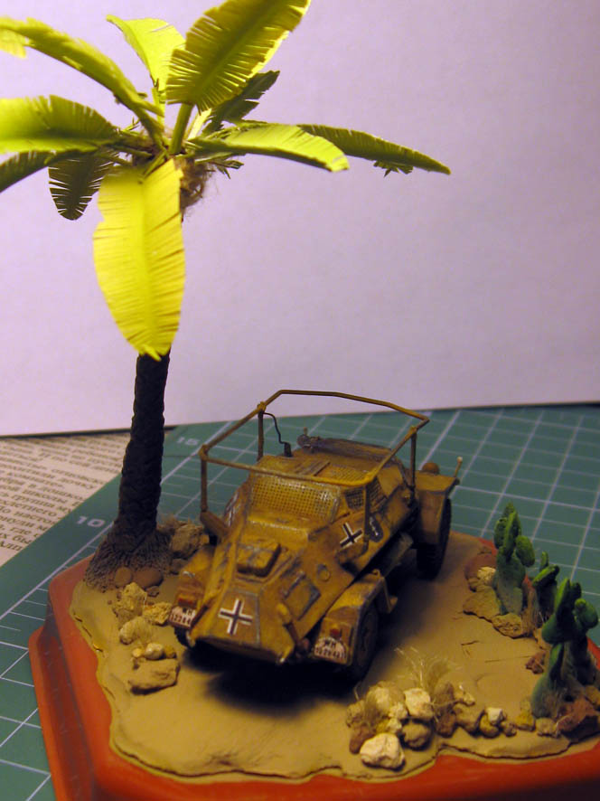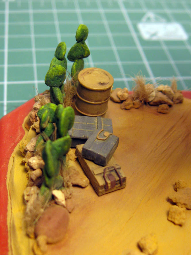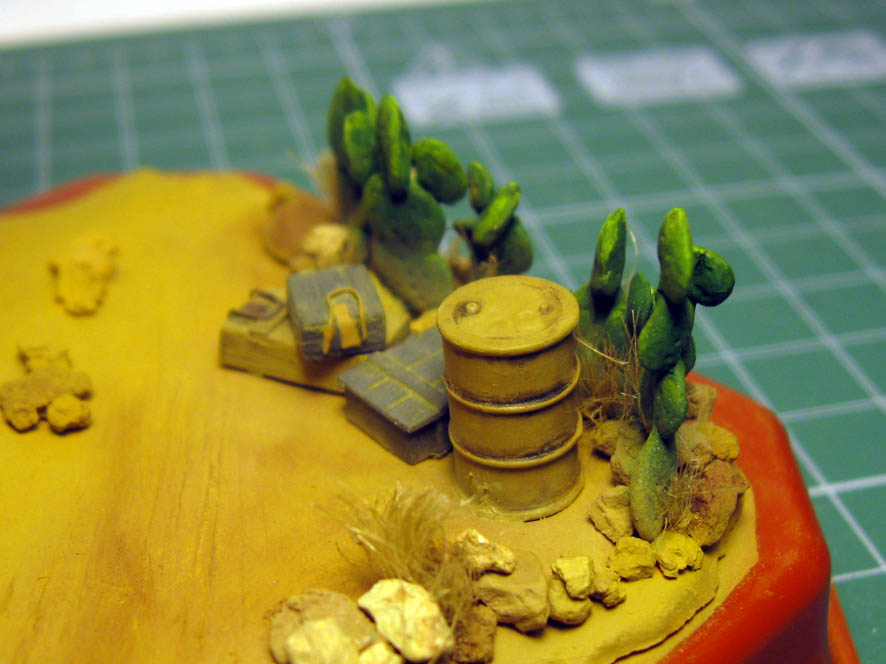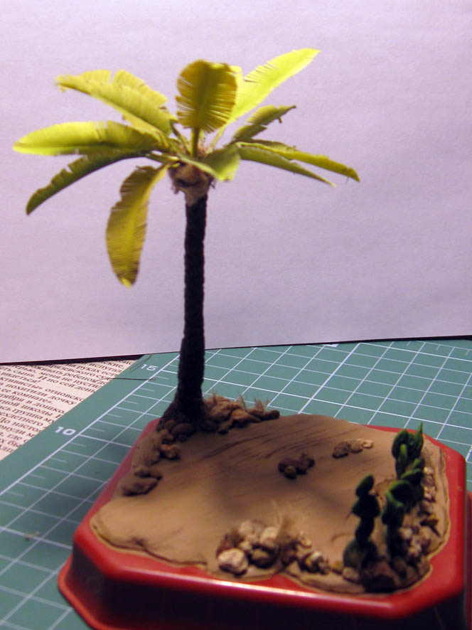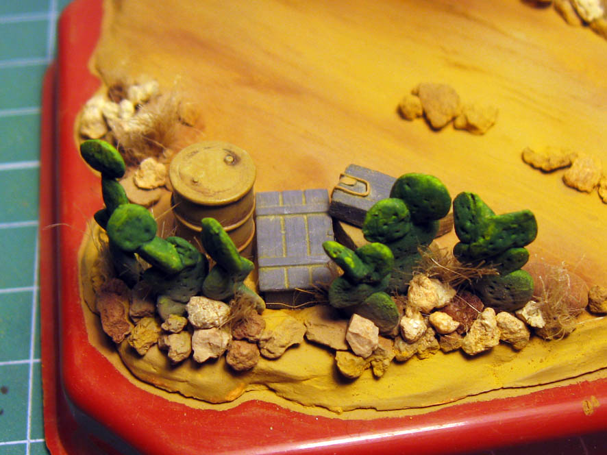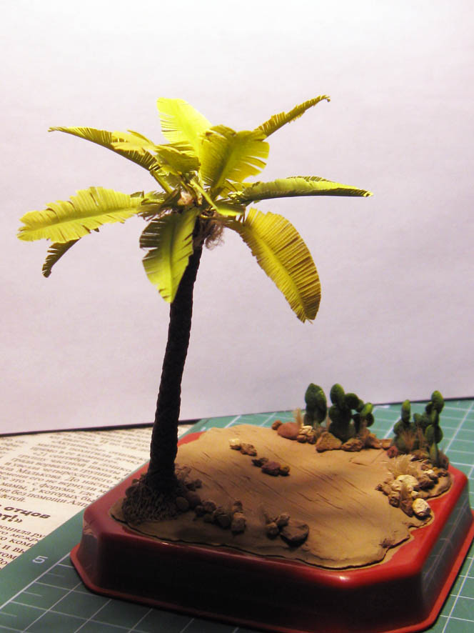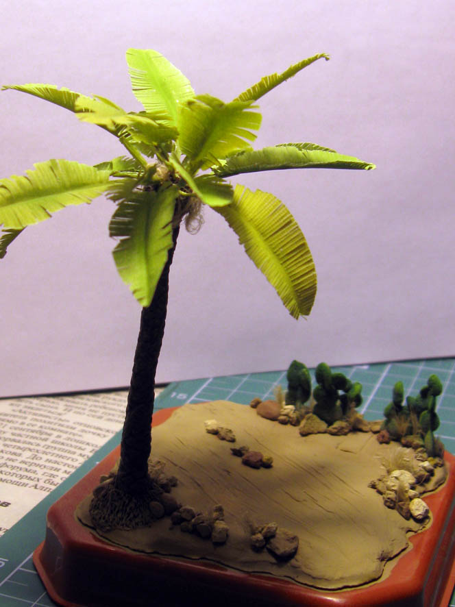 С верху дерева немного добавил сан технического льна. Из него же высадил сухие кустики травы среди камней и кактусов.