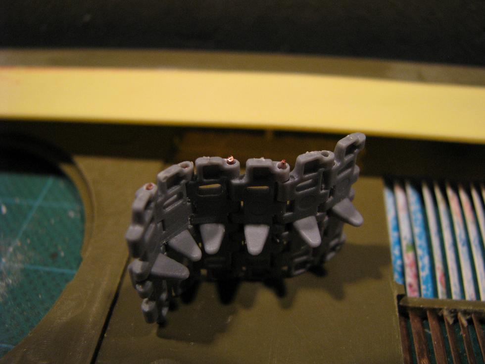 На этот раз работа велась с надгусеничными полками. Раздумывая как их лучше зафиксировать пришёл к решению подклеить куски литника в качестве опор для полос полистирола.