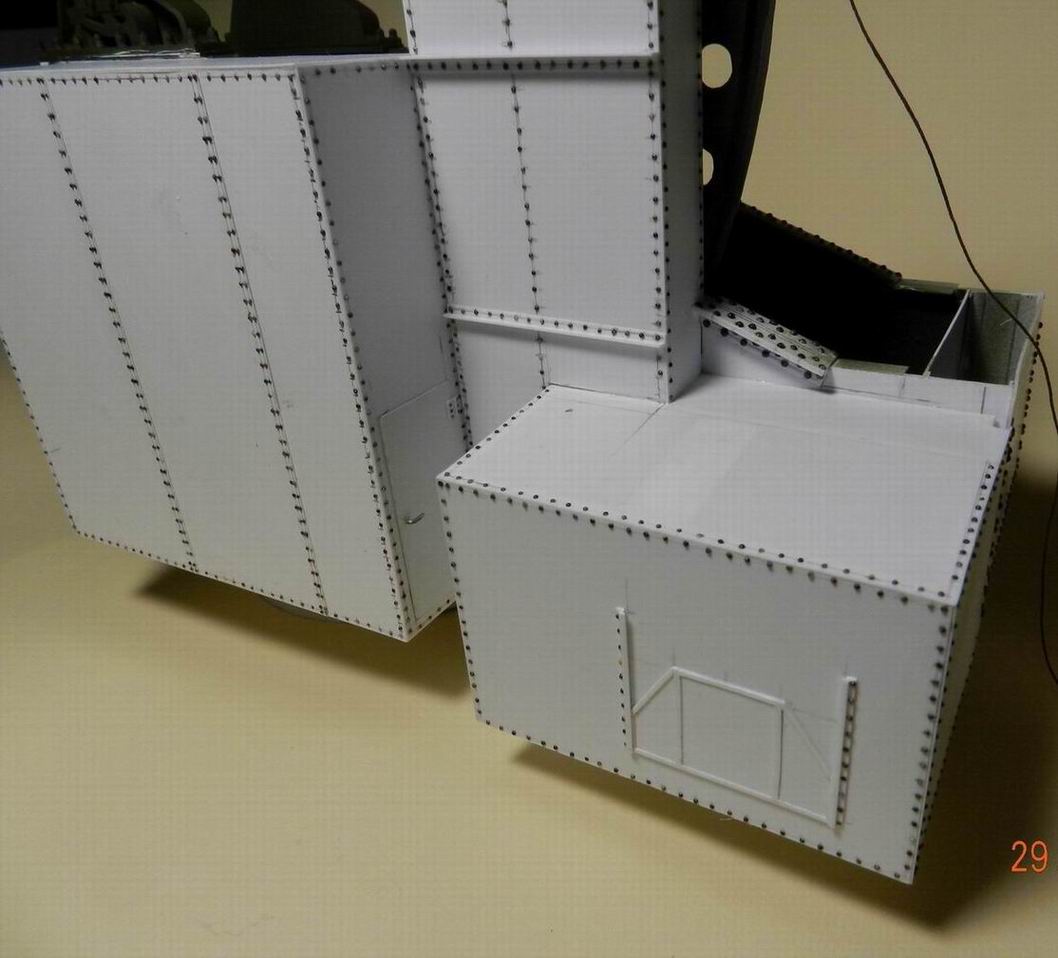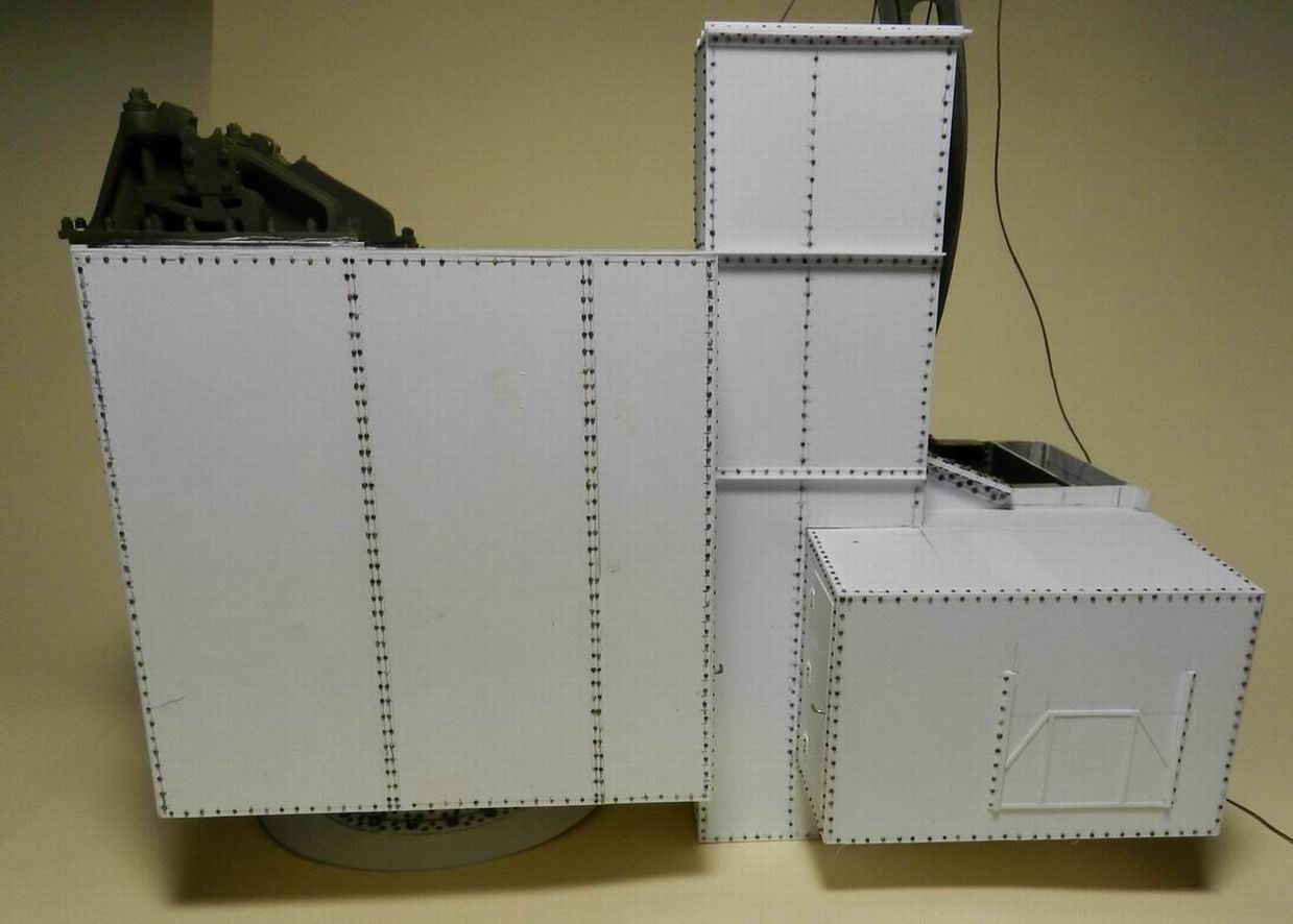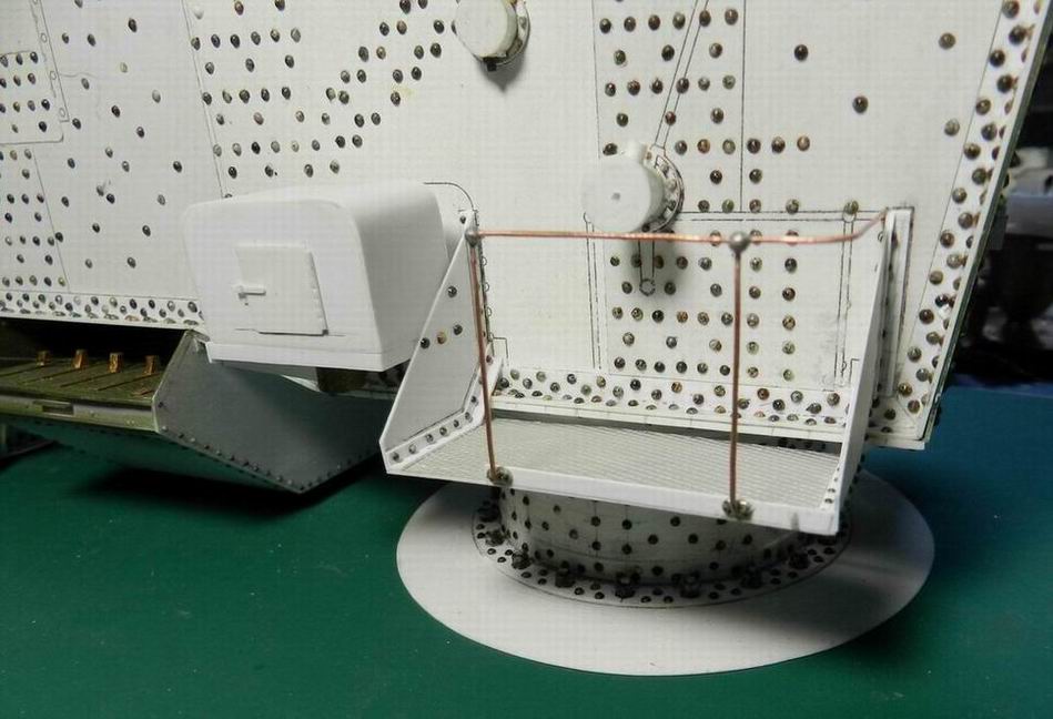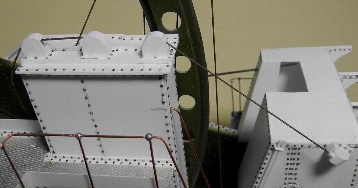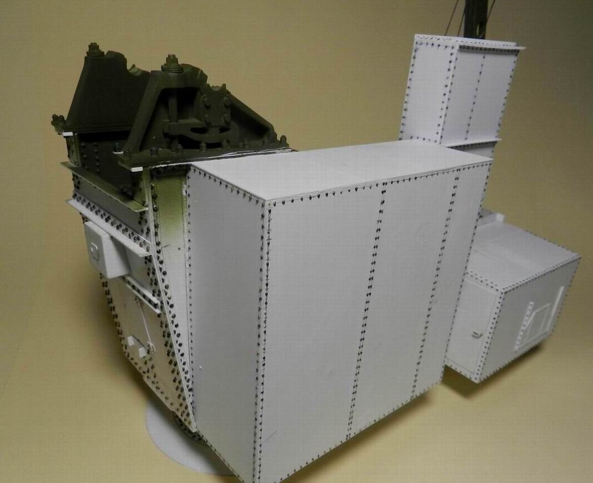 Выкладываю несколько промежуточных фотографий. Сделал рубку для лебёдки подъёма снарядо и полузарядов. На левой боковине изнутри и сзади устанорвил два блока для троса идущего от блока наверху ростры к лебёдке. Прорезь спереди в рубке служит для прохода зарядника при подъёме ствола. Также изготовил площадку вокруг рубки и кронштейны для верхней площадки.